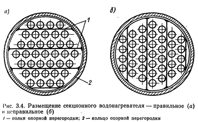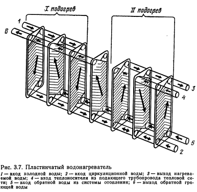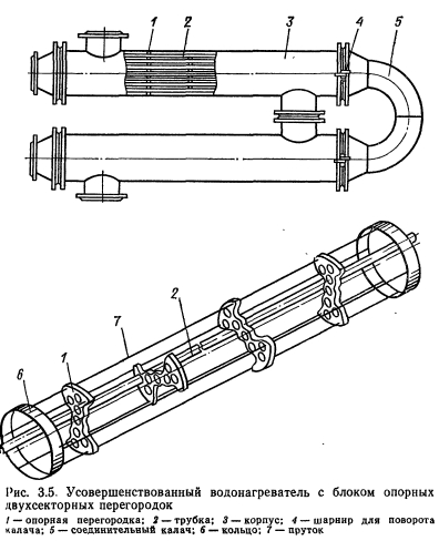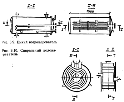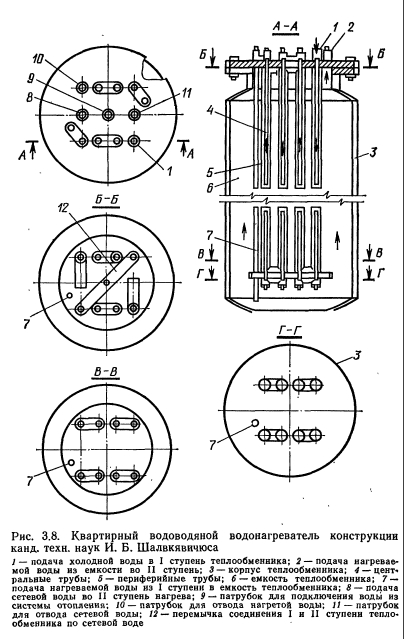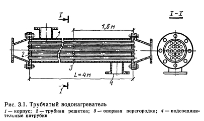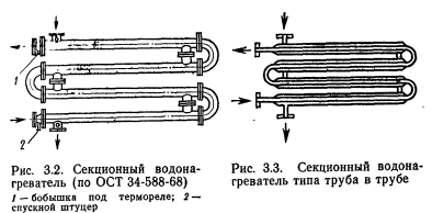 ОБОРУДОВАНИЕ ДЛЯ НАГРЕВА ВОДЫВ системах централизованного теплоснабжения для нагрева воды, идущей на горячее водоснабжение, применяют поверхностные водоводяные водонагреватели Теплоносителем является вода из системы теплоснабжения (сетевая вода). Теплоноситель и нагреваемая вода двигаются по изолированным контурам. Теплопередача осуществляется через стенку, разделяющую оба контура. По форме поверхности нагрева водонагреватели подразделяют па трубчатые и кожуховые, которые могут быть по выполнению корпуса — однокорпусными и секционными, по расположению поверхности нагрева — вертикальными и горизонтальными. Наиболее распространенные трубчатые водонагреватели (рис. 3.1) состоят из стального цилиндрического корпуса с патрубками, через которые проходит теплоноситель, трубного пучка и камеры-крышки с патрубками для входа и выхода теплоносителя из трубного пучка. Трубный пучок вставлен в корпус водонагревателя и состоит из трубок малого диаметра, развальцованных в трубных решетках. В водонагревателях систем горячего водоснабжения нагреваемая вода движется по трубкам, теплоноситель— по межтрубному пространству. Это обусловлено тем, что при нагреве воды выпадает накипь, которую легче удалять из трубок, чем из межтрубного пространства. Такая система движения теплоносителей позволяет также отказаться от устройства специальных компенсаторов для выравнивания линейных расширений металла трубок и корпуса при нагревании. Для снижения коррозии поверхность теплообмена водонагревателей обычно выполняют из латунных трубок с внутренним диаметром 14 мм, наружным 16 мм. Трубки ввальцовывают в трубные решетки, что значительно облегчает замену трубок при ремонте и обеспечивает хорошую плотность соединений. ![]() В горизонтальных водонагревателях для устранения прогиба трубок устанавливают поддерживающие опорные перегородки с таким расчетом, чтобы пролет трубок между точками опор не превышал длину, равную 100— 120 наружных диаметров трубок. Поддерживающие перегородки изготовляют из полосовой стали, привариваемой к кольцу, имеющему наружный диаметр меньше внутреннего диаметра корпуса. Для трубных решеток используют стальные листы толщиной 10—12 мм. Решетки жестко крепят во фланцах присоединительных патрубков корпуса водонагревателя или приваривают непосредственно к корпусу, если нет необходимости в очистке труб от грязи, накипи и коррозионных отложений со стороны межтрубного пространства. Для увеличения интенсивности теплообмена в водонагревателях оба теплоносителя должны иметь достаточно большие встречные скорости движения (противоток). Это наиболее легко достигается в секционных водонагревателях, состоящих из секций с пучком мелких трубок (рис. 3.2), или из секций типа труба в трубе (рис. 3.3), выполненных из стальных труб. Водонагреватели второго типа просты в изготовлении, но обладают большой металлоемкостью. Широкое распространение получили секционные трубчатые водонагреватели конструкции ВТИ-Мосэнерго (ОСТ 34-588—68). Они имеют 11 типоразмеров в соответствии с диаметрами стальных труб, монтируемых в корпусах секций (табл. 1 прил. 4). В настоящеевремя изготовляют секции с условном диаметром до 309 мм включительно. Водонагреватели рассчитаны на рабочее давление 10 ат-м и должны подвергаться гидравлическим испытания