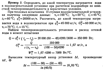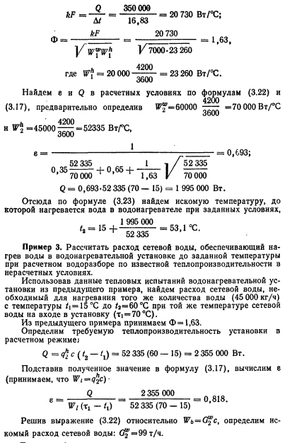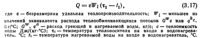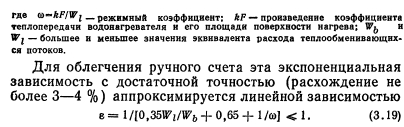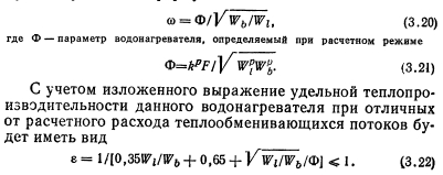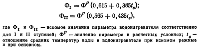 ОПРЕДЕЛЕНИЕ ТЕПЛОПРОИЗВОДИТЕЛЬНОСТИ ВОДОНАГРЕВАТЕЛЕЙ В НЕРАСЧЕТНЫХ УСЛОВИЯХЕсли при расчете водонагревателей известны температуры греющей и нагреваемой воды на входе в водонагреватель и выходе из него, то при нерасчетных условиях обычно знают только температуры теплоносителей на входе в установку. Поэтому выражение для определения производительности водонагревателей Q = =kFAt нельзя применять при установлении режимов, отличных от расчетного, так как величину приходится находить методом последовательных приближений. Расчет таких режимов значительно облегчается при использовании безразмерных характеристик теплообменных аппаратов, которые, как правило, известны. Тогда теплопроизводительность всех видов конвективных теплообменных аппаратов может быть определена по формуле, в которой учитывается не средняя разность температур между теплообменивающимися потоками Д/, а максимальная разность температур греющей и нагреваемой воды на входе в аппарат, ![]() Величина е представляет собой теплопроизводительность водонагревателя, отнесенную к единице меньшего эквивалента расхода теплообменивающихся потоков и одному градусу максимальной разности температур. При противоточном движении теплоносителей в водонагревателе выражение для расчета безразмерной удельной теплопроизводительности имеет следующий вид: ![]() Неравенство показывает, что величина е не может быть больше 1, так как температура нагреваемой среды ни в одном из сечений теплообменного аппарата не может превысить температуру греющей среды. Для соблюдения неравенства в правой части формулы (3.19) пользуются следующим правилом: если по формуле (3.19) получают е<1, то это значение е принимают для дальнейших расчетов; в том случае, когда по формуле (3.19) получается е>1, то для расчетов принимают е=1. Из формулы (3.19) следует, что безразмерная удельная теплопроизводительность противоточного водонагревателя представляет собой отношение теплопроизводительности данного водонагревателя к теплопроизводительности водонагревателя с бесконечной площадью поверхности нагрева при одинаковых в обоих случаях значениях меньшего эквивалента расхода теплообменивающихся потоков и одной и той же максимальной разности температур. Коэффициент теплопередачи водонагревателей является переменной величиной, зависящей от условий теплообмена. В скоростных водоводяных водонагревателях коэффициент теплопередачи в большей степени зависит от скорости теплоносителя, поэтому при изменении расхода одного из теплообменивающихся потоков режимный коэффициент будет также меняться и может быть найден путем пересчета по формуле ![]() ![]() Таким образом, зная эквиваленты расходов Wb и Wi, параметр водонагревателе Ф и температуры греющей и нагреваемой воды на входе в установку ti и tu легко найти по формуле (3.22) величину е, а затем по формуле (3.17) теплопроизводительность водонагревателя при любом режиме. Параметр водонагревателя Ф для данной установки — величина практически постоянная в широком диапазоне изменения Wb и Wi. Однако при изменении температурного режима работы водонагревателей параметр Ф будет меняться в соответствии с зависимостью коэффициента теплопередачи от температур теплообменивающихся сред. Пренебрежение этим обстоятельством может привести к значительной ошибке при опред