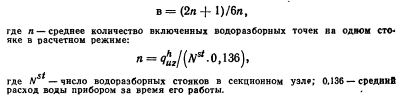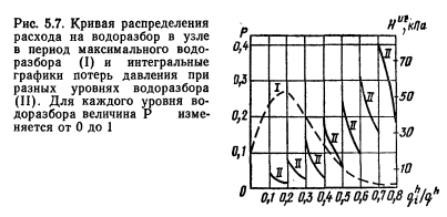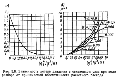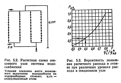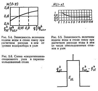 ОСНОВНЫЕ ЗАВИСИМОСТИ ДЛЯ РАСЧЕТА ГИДРАВЛИЧЕСКИХ РЕЖИМОВ В СЕКЦИОННЫХ УЗЛАХВыбор диаметров водоразборных стояков При определении диаметров водоразборных стояков, закольцованных в секционный узел, необходимо учитывать, что по теории вероятности число приборов, включавшихся в узле в период максимального водоразбора, меньше числа приборов, включившихся на одном водоразборном стояке в этот период, умноженном на число стояков в узле. Следовательно, в момент появления расчетного расхода на одном из водоразборных стояков остальные стояки будут загружены меньшим расходом, и снабжение водой наиболее загруженного стояка будет происходить с двух сторон — снизу и через кольцующую перемычку. Величина расхода через кольцующую перемычку зависит от ряда детерминированных (таких, как конструкция секционного узла, число закольцованных стояков) и случайных (уровень расхода в узле, место расположения в каждый момент времени точек отбора воды) факторов. ![]() Для выяснения влияния случайного характера точек приложения водоразбора был выполнен расчет потокораспределения в секционном узле 12-этажного дома, состоящем из четырех закольцованных водоразборных стояков (рис. 5.2). Места включения водоразборных приборов и расход воды через прибор являлись случайными величинами. Расход воды через прибор варьировался между номинальными нагрузками трех типов приборов (мойка, умывальник и ванна) с одинаковой вероятностью. Включение водоразборных приборов происходило до тех пор, пока сумма расходов всех приборов не становилась равной общему расходу на узле. Потокораспределение рассчитывалось для различных уровней расхода в узле. Для исключения влияния циркуляционного расхода предполагалось, что циркуляционный стояк отключен. Обработка результатов расчета позволила выявить следующие закономерности работы секционных узлов. Из графика Р (рис. 5.3) видно, что расчетный расход воды в любом водоразборном стояке узла появляется с различной вероятностью при разных расходах на водоразбор в узле. Например, при расходе в узле, составляющем половину расчетного расхода узла, вероятность появления расчетного расхода в каком- либо стояке узла составляет Р ь =0,25. При расходах в расчетного расхода в каком-либо стояке секционного узла при различных уровнях водоразбора в узле приводит к формированию различных по величине потоков воды в этом стояке. Чем меньше уровень водоразбора в узле, тем больше воды поступает в стояк из кольцующей перемычки. На этот процесс оказывает также влияние и приложение расчетного водоразбора в стояке — чем выше располагаются точки отбора воды из стояка, тем меньший по величине расход воды поступает в стояк снизу. Для более полного описания влияния указанных факторов удобнее всего использовать зависимость математического ожидания расхода от величины расхода воды в узле. Вероятность появления величины (1—х) при расчетном расходе в стояке является условной вероятностью по отношению к расходу в целом в узле. График функции регрессии величины (1—х) от величины расхода в узле представлен на рис. 5.4, из которого видно, что при расходе в секционном узле, равном по величине расходу воды в стояке, поступление воды в этот стояк происходит равными долями снизу и сверху. Это состояние соответствует наличию в узле холостого стояка, незаг