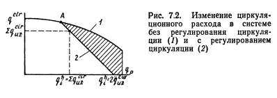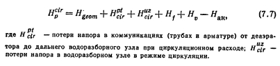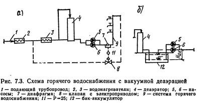 ОСОБЕННОСТИ ПРОЕКТИРОВАНИЯ СИСТЕМ С ВАКУУМНОЙ ДЕАЭРАЦИЕЙВакуумная деаэрация (ВД) является одним из рекомендованных СНиП П-Г.10-73 способов обработки воды для систем горячего водоснабжения (ГВ). Положительным свойством ВД является удаление из воды не только кислорода, но и значительной части растворенной в воде углекислоты, присутствие которой усиливает коррозионные процессы в трубопроводах. Это способствовало распространению вакуумно-деаэрационных установок в системах горячего водоснабжения ряда городов волжского бассейна (Казань, Ижевск и др.), где исходная водопроводная вода имеет повышенное содержание углекислоты. ![]() Однако в системах горячего водоснабжения с вакуумной деаэрацией нарушается сплошность потока из-за разрыва струи в деаэраторе как при водоразборе по тракту «водопровод—потребитель», так и в режиме циркуляции по тракту «водонагреватель—потребитель—водонагреватель». Это требует внесения соответствующих коррективов в известные уже методы конструирования и расчета квартальных систем горячего водоснабжения. При вакуум-деаэрационных установках напор водопровода на вводе в ЦТП может быть незначительным, так как по тракту «ввод—деаэратор» не нужно преодолевать геометрическую высоту системы, т. е. высоту обслуживаемых зданий. Его необходимая величина Нм слагается из следующих составляющих ![]() Подача горячей воды в систему осуществляется повысительными насосами после деаэратора, напор которых определяется из формулы ![]() ![]() На рис. 7.3, а, рассматривается схема с использованием деаэрационной колонны для аккумулирования горячей воды (г. Ижевск), на рис. 7.3,6 схема с баками- аккумуляторами (г. Казань). Общая производительность повысительных насосов рассчитывается на величину ![]() В целях экономии электроэнергии целесообразно применение последовательной или параллельной схемы повысительной установки, состоящей из 2 или 3 разнонапорных повысительных насосов, включаемых в работу в зависимости от величины водоразбора. Циркуляционный насос соединен параллельно с подающими насосами. Напор циркуляционного насоса Нср1 определяется следующими условиями: ![]() Расчетный расход циркуляционной воды определяется по рекомендациям, изложенным ранее. Особенностью работы систем с вакуумной деаэрацией является крайне малое влияние водоразбора на величину циркуляционного расхода. |
