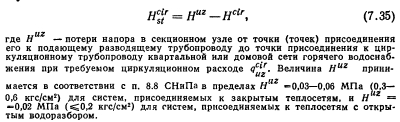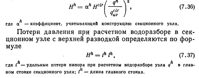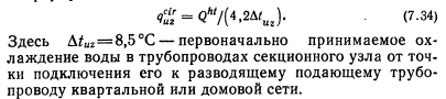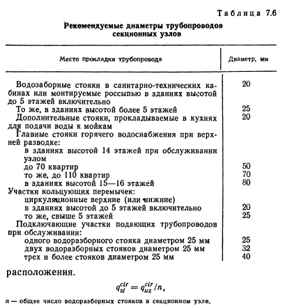ПРОЕКТИРОВАНИЕ СЕКЦИОННЫХ УЗЛОВПри проектировании систем горячего водоснабжения важно принять правильную конструкцию внутри- домовой системы. Для этого можно привести некоторые основные рекомендации. ![]() Внутридомовая система горячего водоснабжения может состоять из секционных узлов или из парнозакольцованных стояков в зависимости от ряда условий. В системах горячего водоснабжения, подключаемых к теплосетям закрытого типа, полотенцесушители, как правило, следует устанавливать на водоразборных стояках. Исключением из этого правила могут быть системы, обслуживающие здания высотой до 4 этажей, в которых отсутствует возможность кольцевания водоразборных стояков в секционные узлы. В системах, присоединяемых к теплосетям с открытым водоразбором, рекомендуется полотенцесушители присоединять к системам отопления ванных комнат круглогодичного действия. Можно считать оправданным отключение полотенцесушителей на летний период только в условиях жаркого климата, т. е. в IV климатической зоне. В остальных случаях отключение полотенцесушителей одновременно с прекращением работы систем отопления приводит к снижению комфортности использования ванной комнаты, а также к увеличению непроизводительных расходов горячей воды, так как перед каждым приемом процедуры потребитель предварительно производит подогрев помещения, пуская горячий душ на более или менее продолжительный период. Кольцевание водоразборных стояков в секционные узлы не производится в тех случаях, когда суммарная протяженность индивидуальных (у каждого водоразборного) циркуляционных стояков меньше длины кольцующей перемычки, если отсутствует возможность прокладки кольцующей перемычки по чердаку здания или под потолком верхнего этажа. Для выбора диаметра водоразборных стояков необходимо определить расчетный расход на водоразбор в нем. Диаметр стояка, не закольцованного в секционный узел, выбирается при расчетном расходе и скорости движения воды в стояке не более 1,5 м/с. Диаметры стояков, закольцованных в секционный узел, выбираются при расчетном расходе воды в стояке с коэффициентом 0,7, и скорости не более 1,5 м/с. Диаметры трубопроводов кольцующих перемычек допускается принимать равными наибольшему диаметру водоразборного стояка секционного узла. Если в здании проектируется система горячего водоснабжения с индивидуальными циркуляционными стояками у каждого водоразборного, то эти циркуляционные стояки необходимо в подвале обвязать индивидуальным трубопроводом и затем участком повышенного сопротивления присоединить этот трубопровод к циркуляционной магистрали квартальной сети. Для упрощения работы по проектированию секционных узлов горячего водоснабжения жилых зданий высотой до пяти этажей и более выбор диаметров трубопроводов допускается прозводить по табл. 7.6. После выбора схемы внутридомовой системы и диаметров водоразборных стояков подключающих участков и кольцующих перемычек определяются теплопотери трубопроводами узла и требуемый циркуляционный расход по формуле ![]() Здесь А=8,5°С — первоначально принимаемое охлаждение воды в трубопроводах секционного узла от точки подключения его к разводящему подающему трубопроводу квартальной или домовой сети. ![]() При этих расходах определяются суммарные потери напора через каждый во