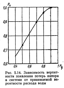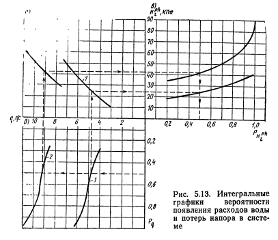 РАСЧЕТНАЯ СХЕМА ЗАГРУЗКИ СИСТЕМЫ ВОДОРАЗБОРОММетодика определения расчетных расходов воды, приведенная в нормативных документах (СНиПах) и литературе для расчета систем внутреннего водопровода, позволяет определять предельные (при заданной обеспеченности) расходы воды на отдельных участках системы. Однако расчет потерь давления на участках системы по предельным расходам по существу не дает ответа на вопрос об обеспеченности суммарных потерь давления в системе в целом. При высокой обеспеченности расчетных расходов вероятность возникновения предельных расходов одновременно во всех участках системы становится практически равной нулю. Система водоснабжения, как система подачи и распределения воды, является гидравлической системой, и характер ее работы определяется законами гидродинамики. Совокупность всех элементов системы характеризуется функцией вида Нр(д). Если на формирование величины случайного расхода оказывает влияние число и степень открытых водопроводных кранов, то на формирование величины потерь напора Я еще и места их включения. Поэтому случайной величиной является не только величина отбора воды, но и место расположения точки отбора. Как показали исследования в период максимального водоразбора, расход воды в системе достаточно точно описывается нормальным законом распределения. Для разработки методики определения потерь напора было проведено моделирование работы системы водоснабжения на ЭВМ. Система состоит из десяти водоразборных узлов 9- этажного дома. Общее число обслуживаемых квартир— 360; в каждом узле закольцованы 4 водоразборных стояка. Условно принималось, что в каждой квартире имеется три типа приборов: мойка, ванна и умывальник с расходами, соответственно 0,2, 0,17 и 0,07 м/с. Включение этих приборов было равновероятным. Включение двух приборов одновременно — ванна- мойка и мойка-умывальник — имело вероятность в пятьдесят раз меньшую. Расход воды на входе в систему описывался нормальным законом распределения. При каждом варианте включения расходов определялись потери напора на каждом участке и суммарные потери напора в системе. На рис. 5.13, б показаны интегральные графики вероятности расходов воды в системе, а на рис. 5.13, в интегральные графики вероятности потерь напора в системах горячего водоснабжения: 1 — объемом 360 квартир, 2 — 720 квартир. Потери напора на каждом отдельном участке определялись по формуле ![]() При равномерном распределении расходов такое конструирование трубопроводов системы соответствует конструированию по закону i—const, т. е. при постоянных удельных потерях давления в системе. ![]() Для всех систем выделялись пять характерных уровней расхода (средние значения интервалов, принятых при построении гистограмм) и для каждого уровня расхода производилась серия розыгрыша ситуаций различных включений водоразборных точек в квартирах. Затем определялись потери напора на каждом участке, суммарные потери напора в системе и средние потери напора для каждой серии. Все расчеты производились на ЭВМ ЕС-1022 по специальной программе «SYSTEM» на языке PL/1. На рис. 5.13 цифрами 1, 2 показаны зависимости средних потерь напора от уровня водоразбора для систем разных размеров. Из графика видно, что величина средних потерь напора в системе при каком-либо уровне расхода обладает той же обеспеченнос