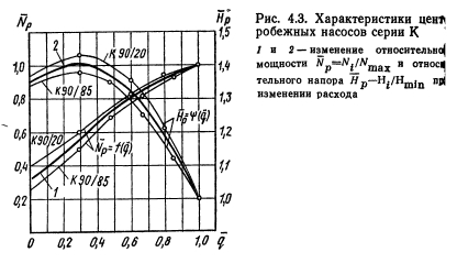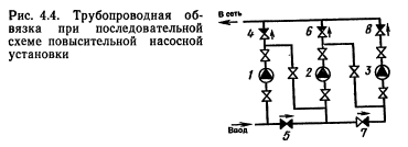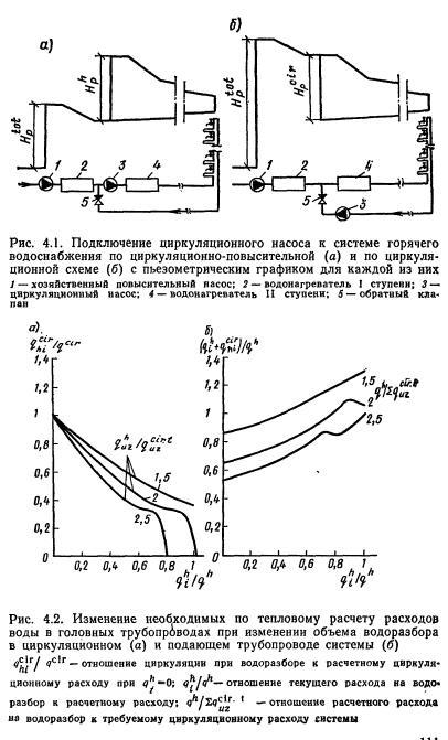 СХЕМЫ НАСОСНЫХ УСТАНОВОК СИСТЕМ ВОДОСНАБЖЕНИЯПовышение этажности жилых зданий и нестабильность давлений в водопроводах крупных городов привели к необходимости предусматривать в системах водоснабжения жилых микрорайонов и отдельных зданий собственные насосные установки, обеспечивающие требуемое повышение давления. Как правило, повысительные насосы обслуживают одновременно системы холодного и горячего водоснабжения. Их устанавливают в центральных и индивидуальных тепловых пунктах. Объединение повысительных установок холодного и горячего водоснабжения сокращает число устанавливаемых насосов, что облегчает их эксплуатацию и управление. В практике проектирования разность в потерях давления не учитывалась, так как по расчетным формулам она получалась незначительной. Это происходило из- за того, что сопротивление водонагревателей в расчетах принималось в 3—4 раза меньше фактического (см. гл. 3). Кроме того, не учитывалось, что фактическое сопротивление систем холодного водоснабжения может быть меньше расчетного в системах, имеющих резервный трубопровод для противопожарного водоснабжения. Так, из-за незнания фактических гидравлических сопротивлений расчетные потери давления в системах горячего водоснабжения принимались на (20-5-25) 104 Па меньше фактических, что вызывало в ряде случаев нарушения в подаче горячей воды в квартиры верхних этажей. Однако уменьшение потерь давления в водонагревателях экономически не оправдано, так как приводит к уменьшению коэффициента теплопередачи и увеличению размеров и стоимости водонагревательной установки. В то же время оборудование таких систем общими повысительными установками потребовало примерно вдвое увеличить расчетный и рабочий напор в них, что вызвало неоправданное увеличение расхода электроэнергии и бесполезные утечки воды в системах холодного водоснабжения. Бесполезные утечки могут быть устранены, если в системах холодного водоснабжения предусмотреть самостоятельные регуляторы давления. Снижение расхода электроэнергии возможно двумя способами: 1) установкой дополнительных повысительных насосов на подающем трубопроводе систем горячего водоснабжения (до подсоединения к нему циркуляционного трубопровода) после общих повысительных насосов; 2) установкой циркуляционного насоса горячего водоснабжения не на обратном трубопроводе, а на подающем. Тогда циркуляционный насос не только поддерживает циркуляцию в системе, но и повышает статическое давление воды в системе горячего водоснабжения (рис. 4.1). Такая схема установки циркуляционных насосов называется циркуляционно-повысительной. Эта схема наиболее проста, поскольку не требуется установки дополнительных насосов. Рассмотрим технические показатели, влияющие на выбор окончательного решения. На графиках (рис. 4.2) показано, как должен меняться циркуляционный расход в системах горячего водоснабжения при изменении уровня водоразбора, чтобы соблюдался заданный температурный перепад до наиболее удаленной водоразборной точки. Как видно, в зависимости от объема системы и изоляции стояков циркуляционный расход должен изменяться в значительных пределах вплоть до полного прекращения. Это означает, что циркуляционный насос, установленный на циркуляционном трубопроводе, основное время работает в неэкономич
