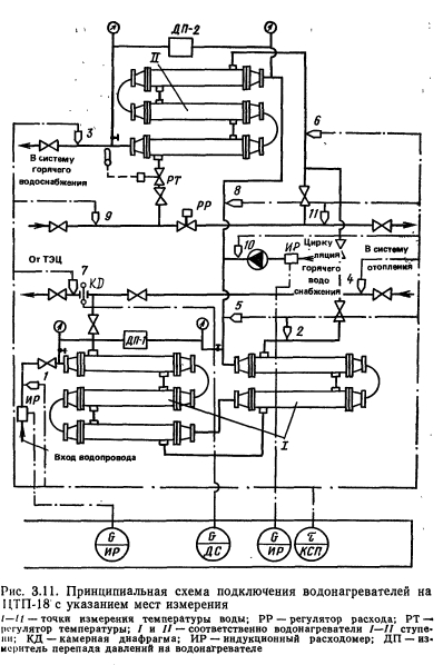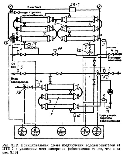 СООТНОШЕНИЕ ФАКТИЧЕСКИХ И РАСЧЕТНЫХ КОЭФФИЦИЕНТОВ ТЕПЛОПЕРЕДАЧИ ВОДОНАГРЕВАТЕЛЕЙНедогрев воды в системах горячего водоснабжения может быть вызван несоответствием фактических и расчетных коэффициентов теплопередачи. Для определения фактических коэффициентов теплопередачи и сопротивления водонагревателей систем горячего водоснабжения проведены испытания водонагревателей на эксплуатируемых ЦТП. Для испытаний выбраны ЦТП в юго- восточном районе столицы, находящиеся в эксплуатации более пяти лет. Испытываемые объекты оборудовались контрольно-измерительными самопишущими приборами для записи температуры и расходов греющей и нагреваемой воды (рис. 3.11 и 3.12). Температура воды измерялась хромель-копелевыми термопарами, запись производилась 12-точечным потенциометром КСП со шкалой 0—150°С (класс точности прибора 0,25). Для измерения расхода воды использовался дифференциальный манометр ДМ, фиксирующий перепад давлений в камерной диафрагме, запись осуществлялась на вторичный прибор ДС1-05 (класс точности прибора 1,0) или индукционный расходомер ИР-11 с записью на одноточечный потенциометр КСП (класс точности прибора 0,5). Потери давления по нагреваемой воде в каждой ступени водонагревателя раздельно определялись дифференциальными перепадомерами ДС-Э с записью каждого на одноточечный потенциометр КСП. Показания приборов проверялись разовыми измерениями: расходомеров ДС — по ртутно-водяному дифманометру ДТ-50, перепадомеров — контрольными пружинными манометрами, температуры — ртутными прецизионными термометрами со шкалой 0—50; 50—100 и 100—150 °С и ценой деления 0,1 °С. ![]() Испытания водонагревателей выполнялись без отключения подачи горячей воды населению, поэтому при обработке результатов испытаний выбирались периоды с неизменным расходом горячей воды или проводился орга- низованный слив горячей воды, чтобы исключить нестационарный режим. При колебаниях расхода сетевой воды через II ступень водонагревателя из-за работы регулятора температуры последний ставился в открытое положение. ![]() Результаты испытаний обрабатывались следующий образом. Сначала определялась теплопроизводительность подогревателя каждой ступени по греющей и нагреваемой воде и проверялся баланс этих величин. На дальнейшую обработку поступали только те результаты, в дебаланс составлял не более 5 %. Затем составилась программа расчета коэффициентов теплопередачи Фактического и теоретического и их сопоставления между >бой. Расчеты выполнялись на электронно-вычислительной машине МИР-2. ![]() Так как отклонения фактических коэффициентов теплопередачи водонагревателей от расчетных значительны, рекомендуется для определения возможностей теплосъема данной установки в каждом конкретном случае проводить ее тепловые испытания по приведенной выше методике. С учетом фактического коэффициента теплопередачи следует определить требуемое число секций водонагревателя, и, если оно выше установленного, то смонтировать недостающие секции. |