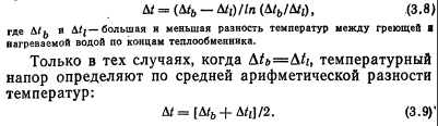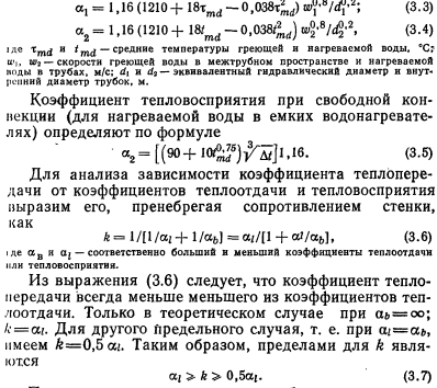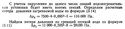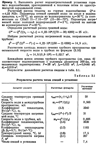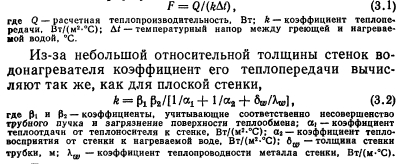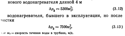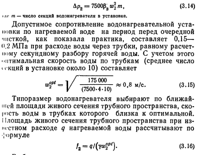ТЕПЛОВОЙ И ГИДРАВЛИЧЕСКИЙ РАСЧЕТ ВОДОНАГРЕВАТЕЛЕЙВ расчет водонагревателей входит определение площади поверхности их нагрева, основных конструктивных размеров и гидравлических потерь в них. Площадь поверхности нагрева водонагревателей рассчитывают по формуле ![]() Для секционных водонагревателей с латунными трубками и опорными перегородками в виде полос коэффициент Р учитывающий неравномерность поля скоростей в трубном пучке, рекомендуется принимать равным 0,92— 0,95. Неравномерность поля скоростей происходит при неравномерном заполнении сечения трубками и может быть вызвана прогибом отдельных трубок, и соответственно сближением их с соседними, а также наличием большого кольцевого зазора между пучком трубок и корпусом. Для водонагревателя с блоком двухсекторных перегородок вследствие поперечно-продольного омывания трубок следует принимать Pi = l,2. Коэффициент р2 зависит от толщины накипи (загрязнения). Накипь из-за малой теплопроводности (коэффициент ее теплопроводности равен 1—2 Вт/(м.°С) против латуни—105 Вт/(м-°С)) снижает термическое сопротивление теплопередачи (особенно значительно в теплообменниках с высокой интенсивностью теплообмена). Для воды средней жесткости при поддержании температуры на выходе из водонагревателя не выше 60 °С расчетную толщину накипи можно принимать 0,3—0,5 мм. Для накипи толщиной 0,5 мм 02=0,85 при ?=700 Вт/(м2°С); 0,8 при 1000 Вт/(м2-°С); 0,72 при 1500 Вт/(м2-°С) и 0,6 при 2000 Вт/(м2°С). Коэффициенты теплоотдачи и восприятия Вт/(м2°С) при турбулентном движении воды вдоль поверхности теплообмена (Re 10000) следует определять по формулам ВТИ: ![]() Поскольку при значительных колебаниях ось пределы изменения ? невелики, для заметного повышения коэффициента теплопередачи теплообменника нужно повышать меньший коэффициент теплоотдачи, а не больший. Как видно из выражений (3.3 и 3.4), теплоотдача возрастает с увеличением скорости и температуры воды. Чем выше температура воды, тем меньше ее вязкость, тем меньше толщина ламинарной пленки и тем больше теп- юпроводность пленки. Температурный напор водонагревателя обычно равен средней логарифмической разности температур: ![]() При подключении трубопроводов к водонагревателю необходимо предусматривать противоток в направлении движения нагреваемой и греющей воды. Противоток обеспечивает наибольшую среднюю разность температур, а следовательно, наименьшую площадь поверхности нагрева. Конструктивные размеры (выбор номера водонагревателя) в большей степени определяются гидравлическими потерями давления по греющей и нагреваемой воде. Потери давления в трубчатом водонагревателе (для воды, проходящей по трубкам и в межтрубном пространстве), Па, вычисляют по общей формуле для шероховатых труб ![]() Первый член в скобках характеризует линейные потери давления, второй — местные. При определении потерь давления воды в трубном пучке чистого подогревателя основное значение имеет первый член, в межтрубном пространстве — второй. Для водонагревателей с соотношением сечения межтрубного пространства fx и присоединительных патрубков /з, близким к единице, потерю давления на одну секцию длиной 4 м можно найти по формуле (с опорными перегородками в виде полок) ![]() Для водонагревателей с блоком двухсекторных опорных перегородок в формулу (3.11) вместо коэффициента 11000 следует подставлять: для ти
