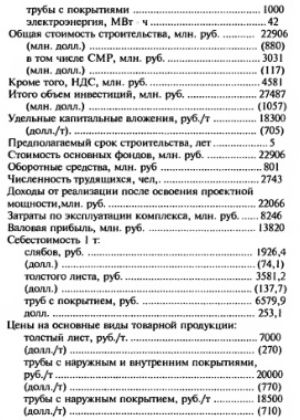 ЭКОНОМИЧЕСКИЕ ПОКАЗАТЕЛИ И ВЫВОДЫ1. Численность трудящихся Численность трудящихся в комплексе производства труб большого диаметра и толстого листа составит 2743 чел. Численность промышленнопроизводственного персонала на вновь сооружаемых объектах комплекса: МНЛЗ, толстолистовом стане 5000, трубоэлектросварочном цехе, энергетических установках, углекислотной станции определена с учетом принятого режима работы оборудования, уровня механизации труда, автоматизации производства и др. Режим работы трудящихся принят для основных производств комплекса — в три смены (с учетом подмены) без выходных дней, для подсобновспомогательных производств — в одну или две смены. Учитывалось, что персонал является технически подготовленным, имеющим необходимую квалификацию. В численность, кроме основных производственных рабочих, включен общецеховой персонал в составе дежурных для текущего обслуживания оборудования толстолистового стана 5000 и трубоэлектросварочного цеха, хозяйственных бригад и младшего обслуживающего персонала. Численность персонала определена с учетом резерва на отпуска и болезни, принятого в размере 10%. Общая численность трудящихся по основным объектам комплекса на полное развитие составит 2438 чел., в том числе на 1ю очередь 1640 чел. Учтена дополнительная численность трудящихся, связанная с доукомплектованием штата действующих объектов общезаводского, энергетического и транспортного хозяйств по оказанию услуг основным объектам комплекса в количестве 305 чел. на полное развитие, в том числе 279 чел.на 1 ю очередь. Приводится разбивка трудящихся по объектам комплекса. 2. Капитальные затраты Капитальные затраты на строительство металлургического комплекса для производства труб большого диаметра и толстого листа определены в текущем уровне цен (по состоянию на 01.11.99 г.) и составляют 28171,91 млн. руб. (в том числе НДС 3. 4695,32 млн. руб. Стоимость основного технологического оборудования принята в соответствии с «Методическими материалами Института экономики ЦНИИЧМ» в 7000 долл. за тонну, что соответствует уровню цен отечественных изготовителей оборудования (Уралмашзавод, ЭЗТМ), которые дали предложения на поставку оборудования для этого комплекса. В отдельных случаях для некоторых видов энергетического оборудования приняты цены заводовизготовителей, а при их отсутствии — по экспертной оценке. Стоимость строительномонтажных работ определена на основании укрупненных сметных нормативов в ценах 1984 г. с привязкой к условиям Свердловской области с помощью коэффициентов, приведенных в арх. № Т136815 (Гип ромез), которые учитывают разницу в заработной плате, в накладных расходах и стоимости материалов. Дополнительно в стоимости учтены затраты на строительномонтажные работы в стесненных условиях. Стоимость оборудования, определенная в долларах США, переведена в текущий уровень по курсу ЦБ РФ 26 рублей за 1 долл. США, а стоимость строительномонтажных работ, определенная в ценах 1984 г., — с помощью регионального индекса К = 16. В сводном расчете стоимости учтены лимитированные работы и затраты, определенные по расчету на основании СНиП, нормативных документов и данных заказчика; резерв средств на непредвиденные работу и затраты 6 %; налог на пользователей автодорог 3 %, НДС 20 %. В связи с возможным уточнением проектных решений и цен на об