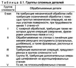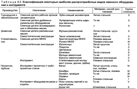 КЛАССИФИКАЦИЯ ЗАПАСНЫХ ЧАСТЕЙ И СМЕННОГО ОБОРУДОВАНИЯВ обобщённом виде для чёрной металлургии может быть принята следующая классификация запасных частей и сменного оборудования. Запасные части подразделяются: а) по видам оборудования, для которого они предназначены (запасные части для горного, обогатительного, коксохимического, доменного, сталеплавильного, ферросплавного, прокатного, трубного, огнеупорного, метизного, силового и энергетического оборудования; для подвижного состава железнодорожного и автомобильного транспорта; для ломоперерабатывающего оборудования; для оборудования цехов главного механика и вспомогательных служб); б) по материалу и видам заготовок (литьё чугунное, стальное, цветное, поковки и штамповки стальные, металлоконструкции, прокат чёрных и цветных металлов); в) по массе (степень дифференциации по массе изменяется в широких пределах в зависимости от её назначения при планировании производства, выполнении проектных, экономических и других расчётов); г) по сложности механообработки (табл. 8.1);