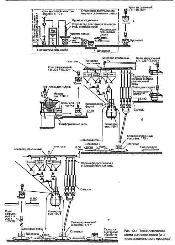 КОНВЕРТЕРНЫЙ ЦЕХ С ОТДЕЛЕНИЕМ НЕПРЕРЫВНОЙ РАЗЛИВКИ СТАЛИ1. Конвертерный цех Конвертерный цех введен в эксплуатацию в 1963 г. В цехе работают четыре 160т конвертера. Проектная производительность цеха около 3,2 млн. т в год жидкой стали, максимально достигнутый объем производства 3,4 млн. т/год. В 1995 и 1996 годах введены в эксплуатацию две установки «печьковш» и один вакууматор. Еще одна установка «печьковш» сооружается. Предусмотрено также сооружение вакууматора N9 2. Так как мощность конвертерного цеха используется не полностью, то необходимое количество дополнительной жидкой стали для производств толстого листа и труб — 1710 тыс. т жидкой стали в год будет выплавляться на существующих мощностях конвертерного цеха без реконструктивных мероприятий. Технологическая схема выплавки стали приведена на рис. 13.1. Работа цеха предусматривается дуплекспроцессом. В работе постоянно находятся три конвертера, четвертый — в ремонте или резерве. Из трех работающих конвертеров один выплавляет полупродукт, а два других — сталь. При этом один из двух выплавляет трубную сталь, которая передается на МНЛЗ № 4, а второй — на МНЛЗ № 1—3. Внепеч ная обработка стали намечается на существующих в цехе агрегатах «печьковш» и вакууматоре. Для обеспечения выплавки низкосернистой трубной стали в составе комплекса предусматривается сооружение отделения десульфурации чугуна, используемого в качестве шихтового материала. 2. Отделение десульфурации чугуна Отделение десульфурации чугуна намечается соорудить на пути подачи чугуна из доменного цеха в миксерные отделения конвертерного цеха. Отделение сооружается во вновь строящемся здании (см. рис. 13.1, а). Мощность отделения десульфурации чугуна позволит обрабатывать весь чугун, необходимый для выплавки стали, для производства труб и толстолистового проката. В составе отделения сооружаются два продувочных стенда для десульфурации чугуна, две машины для скачивания шлака из чугуновозных ковшей, бункера для хранения десульфурирующего реагента, пневматическая система подачи десульфурирующих реагентов от бункеров хранения к продувочной фурме, система отсоса и очистки газов и пыли, выделяющихся при десульфурации чугуна.