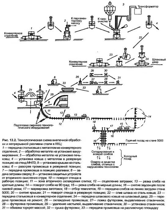 В составе каждого продувочного стенда устанавливают: продувочную фурму с механизмом подъема и опускания; измерительную фурму для замера температуры и взятия проб чугуна; кассету с запасными продувочными фурмами; зонт (крышку) для отсоса газов, образующихся в процессе десульфурации чугуна. Для скачивания шлака из ковшей, установленных на чугуновозах, в отделении устанавливаются две машины. Скачивание предусматривается производить при наклоне ковшей с помощью специальных устройств. Шлак, слитый в шлаковые чаши, на шлаковозах будет вывозиться на шлаковый двор доменного пеха. При подаче чугуна из доменного пеха в мик серные отделения конвертерного цеха чугуновозы с ковшами будут транспортироваться в отделение десульфурации. Два чугуновозных ковша будут устанавливаться под двумя продувочными стендами установок десульфурации. Из ковшей с помощью измерительной фурмы будет браться проба чугуна при замере температуры. С учетом фактического содержания серы в чугуне в пневмокамерный насос будет загружаться расчетное количество десульфурирующего реагента, который затем будет вдуваться в струе азота в чугун. Образующиеся газы и пыль будут отсасываться с помощью крышек и направляться в систему газоочистки. После десульфурации из чугуновозных ковшей будет вторично отбираться проба на содержание серы. Чугуновозные ковши после десульфурации будут на чугуновозах транспортироваться к машинам для скачивания шлака и затем будет осуществляться скачивание шлака из ковшей. После скачивания шлака ковши будут направляться в миксерные отделения конвертерного цеха. В настоящее время в конвертерном цехе для выплавки стали используется чугун со средним содержанием серы 0,03 %. Десульфурация чугуна снижает содержание серы до 0,005 %. В качестве десульфурирующего реагента предпочтителен магний или карбид кальция, обеспечивающие высокую степень десульфурации при их незначительном расходе. Не требуется высокий свободный борт в чугуновозных ковшах (как при использовании извести), незначительно количество шлака, снижающего температуру чугуна. Продувочные стенды установок десульфурации чугуна и машины скачивания шлака оборудуются местными зонтами для отсоса образующихся газов с устройством систем аспирации и газоочистки. Их производительность (из расчета одновременной работы двух машин для скачивания шлака) составляет 400 тыс. м3/ч. Газы удаляют с помощью тягодутьевых машин в отдельно стоящей вытяжной станции после газоочисток. Очищенные в рукавных фильтрах газы выбрасываются в атмосферу через выбросную трубу диаметром 3 м и высотой 60 м. Собранная в рукавных фильтрах пыль увозится в отвал. 3. Непрерывная разливка стали Для организации производства труб большого диаметра в существующем ОНРС конвертерного цеха намечается сооружение слябовой МНЛЗ № 4, которая будет обеспечиваться жидкой сталью от одного из работающих конвертеров (рис. 13.2). Марочный сортамент сталей: углеродистые для судо, мосто и котлостроения и сосудов, работающих под давлением; низколегированные конструкционные и легированные специальные, в том числе трубные. Размерный сортамент отливаемых слябов: толщина 150—350, ширина 2700, длина 3360—4800 мм; максимальная масса сляба 35,4 т, объем производства по годным слябам 1650 тыс. т в год. Тип машины: криволинейная с многоточечным 