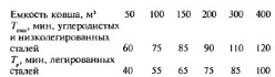 Определение параметров разливки стали на МНЛЗПараметры разливки стали на МНЛЗ определяются из размерного и марочного сортамента отливаемых заготовок с учетом максимально допустимой продолжительности разливки металла из сталеразливочных ковшей необходимой емкости Ниже представлена максимально допустимая продолжительность разливки на МНЛЗ стали из сталеразливочных ковшей различной емкости (7тах) и рекомендуемая для расчетов реальная продолжительность разливки (Г) Максимально допускаемая продолжительность указана на основании теоретических расчетов падения температуры стали в сталеразливочных ковшах и практического опыта разливки Рекомендуемая продолжительность учитывает достижения в развитии непрерывного процесса разливки и возможной организации взаимной работы МНЛЗ и сталеплавильных агрегатов