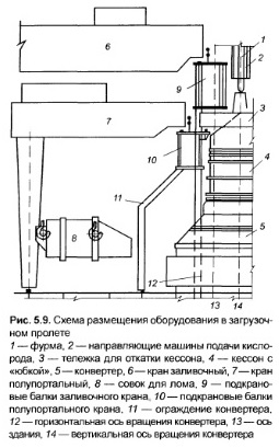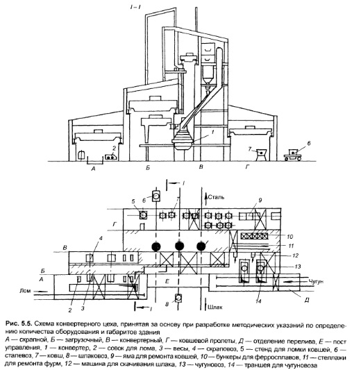 За основу при разработке методики определения габаритов отдельных пролетов конвертерного цеха принята схема цеха, представленная н<л рис 5 4, а Методика расчета участка подачи чугуна рассмотрена как для отделения перелива, так и для миксерного отделения Приведена методика расчета отделения перестановки шлаковых ковшей, хотя такая схема не рекомендуется для новых цехов Скрапной пролет Рассматривается вариант с подачей основной части лома в скрапной пролет в совках, установленных на железнодорожные платформы Расчет скрапного пролета начинается с определения площади ямы для хранения лома (лом, находящийся в яме, используется для корректировки навески, а также при ремонте крана для перестановки совков) При расчете площади ямы а) определяется суточная потребность в ломе, б) задается запас лома в скрапном пролете Он зависит от условий предприятия (наличие складов лома за пределами конвертерного цеха, работа на привозном или оборотном ломе и т д) Подача лома в совках свидетельствует о наличии на заводе скрапоразделочного цеха и поэтому не требует организации больших запасов лома в скрапном пролете Достаточно принять запас лома на 0,5—1 сут, задаются нагрузкой на 1 м2 площади ямы При нормальном качестве лома («1 т/м3) ее можно принимать равной 4 т/м3, что соответствует глубине ямы 3 м и общей высоте слоя лома «4м При выборе пути подачи лома определяется а) количество платформ в составе, на котором в пролет подаются совки (для предварительных расчетов четыре—шесть), б) время снятия груженого совка с платформы и установки на нее порожнего совка, в) время пребывания состава в пролете время обработки всех платформ плюс 10 мин на замену составов, г) количество составов, которое может пропустить один путь, и количество плавок, которое он может обслужить в течение суток, д) потребность в железнодорожных путях (суточное количество плавок делят на количество плавок, которое может обслужить один путь). Как правило, в скрапном пролете большинства цехов достаточно одного пути. Методика расчета ширины пролета выполнена с учетом этого условия. Если по расчету путей требуется больше, то ширина пролета увеличивается. Она определяется составом оборудования и сооружений, размещаемых в пролете в поперечном направлении. При подаче лома в совках по ширине пролета размещаются: железнодорожный путь подачи лома, яма для хранения лома, совки на борту ямы (и в тех же габаритах — платформенные весы). Минимальная ширина пролета по кромкам колонн слагается из следующих величин: прохода между колонной и железнодорожной платформой 0,7 м; ширины платформы (обычно 3,6 м); прохода между платформой и ямой, равного 0,7 м (в случае применения саморазгружающихся вагонов проход отсутствует); толщины ограждения ямы со стороны пути (обычно 0,35 м); ширины ямы; толщины ограждения ямы со стороны совков (обычно 0,35 м); прохода между ямой и совками, равного 0,7 м; зоны размещения совков (длины совка); прохода вдоль пролета (1 м). Все величины, влияющие на минимальную ширину скрапного пролета, принимаются либо по нормативам, либо по характеристике оборудования. Исключение составляет ширина ямы, которая определяется с учетом следующих соображений: узкая, но длинная яма неудобна в работе, поскольку приводит к удлинению пробега кранов; широкая, но короткая неудобна — краны при работе мешают о