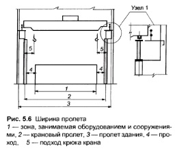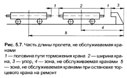 Часть устанавливаемого в пролете оборудования нуждается в постоянном крановом обслуживании, и его желательно размещать в средней (по длине) части пролета, в зоне действия нескольких кранов В случае размещения этого оборудования в торцах пролета должны учитываться периодическая остановка крайних кранов на ремонт и необходимость участия в работе соседних кранов Габариты подхода соседнего крана к торцу цеха слагаются из величины упора, зазора между упором и буфером крайнего крана, ширины крайнего крана по буферам, зазора между буферами крайнего и соседнего с ним кранов (равного половине пути торможения), расстояния от оси соседнего крана до конца его буфера