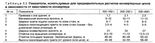 Пролет здания на участке конвертеров слагается из: привязки конвертера к оси здания; зоны, обслуживаемой краном: подхода крюка крана к подкрановой балке со стороны тракта подачи сыпучих: расстояния между осью подкрановой балки и осью стойки, разделяющей участки конвертеров и сыпучих. Особенность расчета — учет излома колонны в ее верхней части для обеспечения подхода крюка крана к оси конвертера. Затем определяется привязка ограждения конвертера к оси здания. Ограждение располагается по кромке выреза для конвертера в рабочей площадке. Габариты выреза задает заводизготовитель. Расстояние между горловиной поваленного конвертера и кромкой выреза составляет обычно 0,8—1,0 м. Для предварительных расчетов можно принимать минимальные величины пролета конвертерного участка, приведенные в табл. 5.3 (п. 2). Тракт подачи сыпучих проектируется специализированной организацией. Габариты зависят, в частности, от расхода сыпучих материалов, продолжительности их хранения, способа подачи в конвертер и т.д. Для предварительных расчетов можно принимать значения ширины тракта подачи сыпучих по осям по данным табл. 5.3 (п. 3). Газоотводящий тракт также проектируется специализированной организацией. Габариты зависят от емкости конвертера (расхода кислорода), типа газоотвода (с дожиганием или без дожигания), конструктивных решений (см. табл. 5.3, п. 4). Общая ширина конвертерного пролета определяется с учетом данных по оборудованию, устанавливаемому в пролете и проектируемому специализированными организациями. Положение оси колонн между конвертерным и загрузочным пролетами определено в расчетах по загрузочному пролету. Ось между конвертерным и ковшевым пролетами проходит в средней части колонны. Для предварительных расчетов можно принимать значения ширины конвертерного пролета, приведенные в табл. 5.3, п.5. Расчет высоты ведут раздельно для каждого участка. Отметка оси вращения конвертера слагается из отметки ковша на сталевозе (по каталожным данным), зазора между верхом ковша и радиусом вращения горловины, равного обычно 0,5 м, радиуса вращения горловины по данным заводаизготовителя (см. табл. 5.3, п. 6). Отметка горловины конвертера в вертикальном положении определяется по данным завода—изготовителя с учетом оси вращения. Устанавливаются: расстояние между радиусом вращения горловины конвертера и низом кессона подъемного газохода (рекомендуется 0,5 м) без учета отметки низа «юбки» в связи с настылеобразовани ем на горловине); расстояние от низа кессона до точки выхода из него фурмы (зависит от конструкции кессона и задается заводомизготовителем). Заводомизготовителем ведется расчет хода и полной длины фурмы. Отметка сопла должна быть в нижнем положении на 0,4 м выше уровня спокойной ванны в конвертере, а в верхнем — на 1 м выше отметки выхода из кессона. Полная длина фурмы включает отметку серьги для зацепления краном при верхнем положении фурмы. Определяется отметка площадки, на которой размещается привод перемещения фурмы (см. табл. 5.3, п. 7). Отдельно определяется отметка головки подкранового рельса крана для смены фурм. Вертикальный подход крюка должен превышать отметку серьги на 1 м. Поскольку подкрановая балка находится над приводом перемещения фурмы, необходимо обеспечить проход высотой 2 м под балкой по площадке для привода, что может по