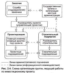 По каждому значимому виду и процессу производства проектной продукции или предоставления проектных услуг реализуется программа качества, взаимоувязанная со всеми другими требованиями системы качества и обеспечивающая выполнение конкретных требований к проектной продукции, услуге или обязательствам по конкретному договору Программа качества особенно необходима при разработке ранее не осуществлявшегося в данной организации проекта или при разработке новых видов проектной продукции (по ранее охватываемым разделам проекта, маркам рабочей документации) или при проектировании нового вида объекта строительства. В общем случае программы качества обеспечивают механизм привязки конкретных требований, касающихся проектной продукции, услуги или договора на их разработку, к существующим общим процедурам системы качества. Программы качества должны определять: Программы качества по отдельным видам проектной продукции или услуг могут быть, если это целесообразно, включены в «Руководство по качеству проектирования» или в Руководстве могут содержаться ссылки на имеющиеся программы качества. При разработке программ качества следует руководствоваться ISO 1000595 «Административное управление качеством. Руководящие указания по программам качества». Проектная организация должна обеспечивать разработку и внедрение документированных процедур как средства идентификации, сбора, индексирования, получения, систематизации, хранения, ведения, поиска и размещения соответствующих данных о качестве. Должны быть разработаны правила обеспечения доступа к зарегистрированным данным о качестве и их получения потребителями и субподрядчиками. В рамках системы качества проектной организации виды деятельности, которые прямо или косвенно воздействуют на качество проектной продукции и услуг, должны быть документально зафиксированы. Для этого необходимо: Политика в области качества реализуется в конкретные плановые периоды проектной организацией в виде программ, планов, заданий по качеству в договорах, календарных планах и графиках проведения проектноизыскательских работ, а также иной организационнотехнической документации планового и распорядительного характера. Опираясь на систему качества, осуществляют организационнотехнологическую подготовку проектирования с целью формирования оптимальных для конкретных условий технологических процессов проектирования, контроля за ведением и правильностью использования технологической документации, за соблюдением технологической дисциплины, качества и сроков выполнения технологических процессов проектирования, координации работ по подготовке проектирования. Организация работ по инвестиционному проекту обеспечивается полноценным участием и позитивным взаимодействием специалистов, представляющих интересы Заказчика (Инвестора), Проектировщика и Подрядчика (Строителя). Коллектив специалистов из представителей указанных субъектов инвестиционной деятельности можно характеризовать как группу, работающую над конкретным проектом. Типичная схема современной организации группы инвестиционного проекта представлена на рис. 2.4. Административное взаимодействие по управлению проектом осуществляется Заказчиком (с одной стороны) и руководителем проекта, Проектировщиком и подряд
