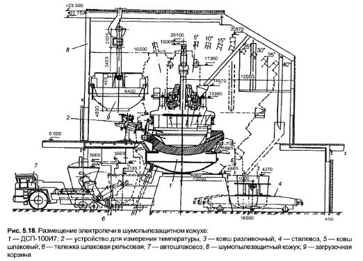Основные параметры здания цеха и их определениеЗдания ЭСПЦ с крупными дуговыми печами выполняются, как правило, в металле. Определяющим пролетом в здании цеха является печной. Основные параметры печного пролета с продольным размещением кранов — ширина пролета, высота рабочей площадки, высота до головки подкранового рельса в первую очередь зависят от размеров шумопылезащитного кожуха электропечи (ШПЗК). Размещение в ШПЗК электропечи емкостью 100 т типа ДСП100И7 и ее основные размеры показаны на рис. 5.18, отражающем следующие технологические операции, осуществляемые в процессе эксплуатации электропечи: наклон печи до 40° для слива металла в ковш, наклон печи 12° в сторону слива шлака, загрузка электропечи скрапом, операции, связанные с электродами.