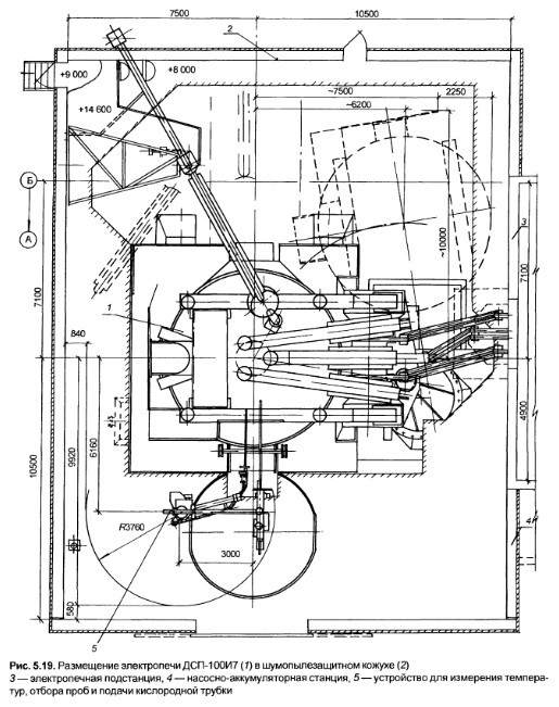 В верхней части рис. 5.18 показано перемещение верхней части электрододержателя печи с электродом. Траектория электрододержателя позволяет определить высоту кожуха и расстояние от оси печи до стены кожуха в сторону слива металла. Рисунком проверяется, как осуществляется сливуглах наклона печи металл попадал в ковш. При наклоне каждая точка электропечи проходит сложную траекторию: одно движение каждой точки — по окружности с радиусом от оси вращения печи до данной точки, второе — поступательное при перекатывании люльки печи по фундаментной балке. Результат этих движений следует складывать для каждого рассматриваемого угла наклона печи. И только точка центра вращения печи перемещается по прямой горизонтальной линии. Одновременно с проверкой траектории слива металла в ковш на сталевозе устанавливается и правильность требования конструктора электропечи об отметке рабочей площадки печи над уровнем пола цеха. Уровень этой отметки рельса сталевоза принимается обычно нулевым, т.е. соответствует полу цеха, что обеспечивает удобство перемещения в цехе автотранспорта. Для обеспечения наклона печи до 12° в сторону слива шлака (см. рис. 5.18) определяется местоположение ковша для шлака и проверяется траектория сливаемого из печи шлака в шлаковый ковш. На рис 5.18 выполнена проработка, показывающая, что принятая отметка рабочей площадки цеха и отметка низа балок рабочей площадки позволяет осуществить съем заполненной чаши со шлаковой тележки под электропечью с помощью автошлаковоза и установку шлаковой чаши на платформу автошлаковоза. Для загрузки электропечи скрапом в левой верхней части рис. 5.18 показана загрузочная корзина, висящая на крюке крана. Размеры ШПЗК должны позволять следующие технологические операции при закрытом кожухе: отворот свода электропечи; подачу бадьи краном в положение загрузки скрапа; открывание челюстей бадьи для высыпания скрапа в печь, закрывание челюстей бадьи и отвод ее от печи, возвращение свода электропечи в исходное положение, опускание электродов и включение печи. Кожух должен быть закрытым для эффективного улавливания пыли, интенсивно выделяющейся в момент загрузки скрапа. Взаимное расположение бадьи и электропечи в ШПЗК при выполнении отдельных операций при загрузке печи скрапом позволяет определить привязку стены ШПЗК от оси печи со стороны скачивания шлака. При загрузке скрапа в печь для нормального прохода бадьи над печью и для раскрывания челюстей бадьи зазор между низом бадьи и верхним срезом корпуса электропечи должен быть не менее 300 мм. При этом проверяется отметка низа перекрытия ШПЗК и определяется отметка подкранового рельса загрузочного крана. Проверяются операции, связанные с электродами. В правой верхней части рис. 5.18 показан электрод максимальной длины при верхнем положении электрододержателя электропечи, соответствующем отвороту свода печи. Низ электрода должен находиться выше нижней части свода на «250 мм, чтобы исключить поломку электродов кусками скрапа при возвращении свода в исходное положение после загрузки скрапа в печь. По верхней отметке электрода проверяется отметка низа перекрытия ШПЗК. Можно проверить возможность (по высоте) установки в электрододержатель (в его нижнем положении) электрода крюком малого подъема завалочного крана и, таким образом, 