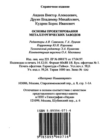 В. А. Авдеев, В. М. Друян, Б. И. Кудрин, Основы проектирования металлургических заводов, М., 2002 |