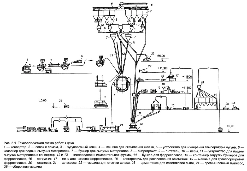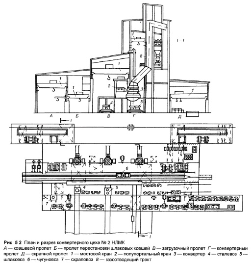 Схема работы цехаВыбор схемы работы цеха влияет на объёмнопланировочные решения и поэтому предшествует их разработке. При выборе схемы работы рассматриваются разные возможные решения и выбирается вариант, наиболее подходящий к условиям проектируемого цеха. Основные из возможных вариантов рассматриваются ниже. Один из них, разработанный для конвертерного цеха НЛМК, представлен на рис. 5.1 (разрез — на рис. 5.2). Подача и завалка лома определяются тем, что основная часть лома поступает в конвертерный цех из скрапоразделочного цеха. Обычно используется один из двух способов подачи лома в скрап ной пролёт: в совках, с дальнейшей корректировкой навески; навалом, с разгрузкой в яму и дальнейшей погрузкой совками. При подаче навалом общий объём крановых работ возрастает: лом вначале грузится на вагоны в скрапоразделочном цехе, затем разгружается в яму скрапного пролёта, после чего загружается в совки. При подаче в совках объём крановых работ в скрапоразделочном цехе остается практически неизменным, а в скрапном пролете значительно уменьшается и сводится к перестановке совков и корректировке навески. Однако подача лома в совках имеет недостатки: из скрапоразделочного цеха в конвертерный и обратно постоянно перевозится лишний груз (совки), в скрапном пролёте требуется установка тяжелого крана для перестановки совков с увеличением массы металлоконструкций здания, ростом затрат, увеличивается парк совков. Возникают и сложности с обеспечением оптимального состава лома в завалку (определённое соотношение легкого и тяжёлого лома, пакетов и т.д.), поскольку лом этих видов образуется в разных отделениях скрапоразделочного цеха. Для обеспечения оптимального содержания компонентов состав с совками потребуется передавать для погрузки из пролёта в пролёт, что осложнит организацию работ в скрапоразделочном цехе. Могут быть рекомендованы следующие решения по подаче лома в скрапной пролёт: для конвертерных цехов небольшой производительности при малом содержании лома в шихте предпочтительна подача лома навалом. При этом рекомендуется подавать лом в саморазгружающихся вагонах (думпкарах) или автосамосвалах; для цехов высокой производительности рекомендуется подача лома в совках. На ряде заводов практикуется подача лома в автосамосвалах с разгрузкой их непосредственно в совки, установленные на скраповозах. Такой способ работы позволяет сократить количество кранов в скрапном пролёте, но имеет недостатки: невозможность обеспечения оптимального состава лома в завалку; плохое использование площади скрапного пролёта, основная часть которого занята путями скраповозов, уложенными вдоль пролёта; ударное воздействие большой массы лома на скраповоз при разгрузке. Поэтому этот способ работы не рекомендуется для новых цехов. Во всех случаях лом поступает в специализированный скрапной пролёт. Совки с ломом в загрузочный пролёт передают, как правило, на скраповозах. Лом загружают в конвертер в современных цехах обычно кранами. При этом возможны два основных способа использования кранов: для завалки лома применяют краны, перемещающиеся по общим подкрановым путям с кранами для заливки чугуна (иногда для обеих операций используются одни и те же краны); завалку лома проводят полупортальными кранами, работающими независимо от заливочны