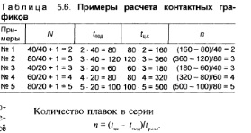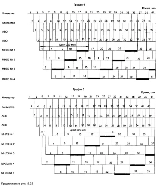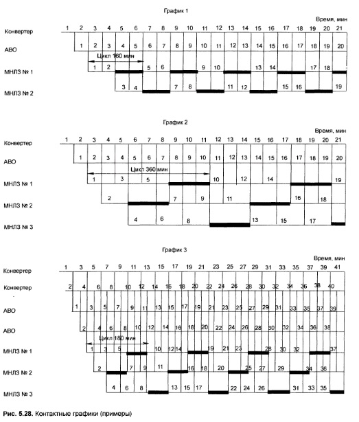 Согласование работы агрегатов сталеплавильных, внепечной обработки стали и МНЛЗСталеплавильные цехи, включающие отделения непрерывной разливки стали, относятся к производственным системам, в которых несогласованность и напряжённость в работе оборудования может привести к потерям. Разные мощности производственных агрегатов, высокая степень непрерывности технологического процесса, необходимость одновременной отливки заготовок разных сечений — всё это весьма осложняет согласование. Основа согласованной работы — контактные графики, при построении которых прежде всего определяют условия согласованной работы 1. Время разливки плавки на МНЛЗ должно быть равным или кратным циклу поступления плавок от сталеплавильных агрегатов на разливку. 2. Время обработки стали на агрегатах внепечной обработки должно быть равным или меньше времени разливки. 3. Время подготовки МНЛЗ между разливками должно быть равно или кратным циклу поступления плавок от сталеплавильных агрегатов на разливку. Рассмотрим несколько примеров работы МНЛЗ. При работе одного конвертера с временем плавки 40 мин цикл поступления плавок в ОНРС составит также 40 мин, а при работе двух конвертеров — 20 мин. Тогда время разливки плавки будет: при работе одного конвертера 40 или 80 мин, двух —40, 60 или 80 мин. Время внепечной обработки во всех случаях должно быть < 40 мин.