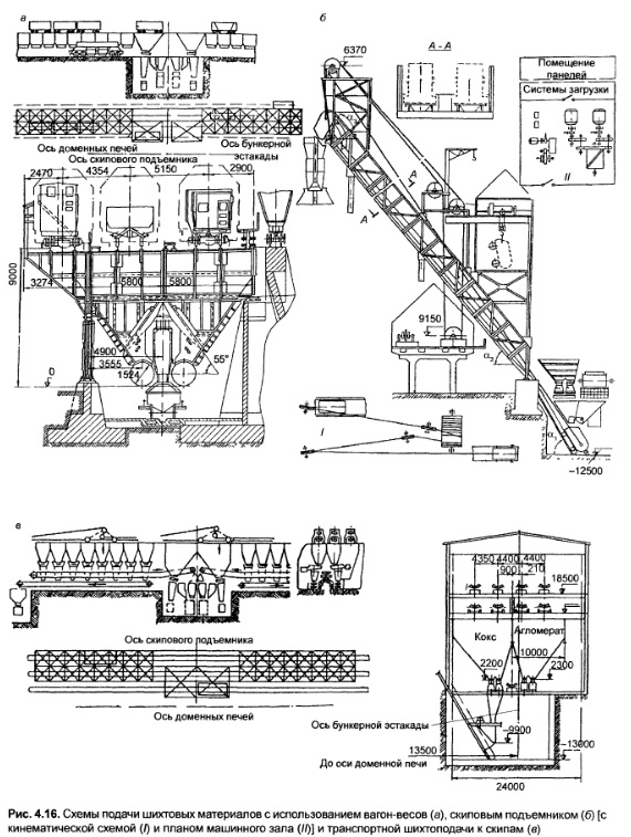 СПОСОБЫ ПОДАЧИ ШИХТОВЫХ МАТЕРИАЛОВ НА КОЛОШНИК ДОМЕННОЙ ПЕЧИДля работы доменной печи требуется бесперебойная подача шихтовых материалов к загрузочному устройству на колошнике. В сутки их подается на высоту не менее 60—70 м 20—25 тыс. т. К машинам для подачи шихтовых материалов предъявляются весьма жесткие требования, так как любой перебой в загрузке материалов приводит к переводу печи на тихий ход или полной ее остановке. Поэтому эти машины должны иметь высокую производительность, повышенную надежность при эксплуатации и обеспечивать возможность полной автоматизации процесса загрузки печи. В случае значительного понижения уровня шихты в печи машины должны обеспечивать форсированный режим подачи материалов к загрузочному устройству и последующей их загрузки в печь. Применяют два основных способа подачи шихтовых материалов в доменную печь — скиповый и конвейерный. В первом случае все материалы подаются скипами из скиповой ямы бункерной эстакады вблизи доменной печи, а во втором — конвейерами из шихтовых бункеров вдали от доменной печи. Главные факторы, обусловившие использование конвейеров для загрузки доменных печей большого объема, — значительное увеличение производительности печей, при котором скиповые подъемники не могли обеспечить требуемый темп загрузки, и применение хорошо подготовленной шихты. При конвейерной подаче материалов упрощается обслуживание и ремонт оборудования, исключаются значительные динамические нагрузки на несущие стальные конструкции, снижается стоимость строительства изза отсутствия скиповой ямы и появляется возможность раздельного строительства доменной печи и системы загрузки шихты. Конвейерная подача шихты на колошник лучше приспособлена для комплексной автоматизации доменной печи. Увеличивается производственная площадь вокруг доменной печи для уборки жидких продуктов плавки, в том числе размещения установок придоменной грануляции шлака. Бункерная эстакада предназначена для создания запасов компонентов доменной шихты, их усреднения и непрерывной подачи к скиповому или конвейерному подъемнику на колошник печи. Расположение бункерной эстакады и ее конструкция должны обеспечить механизацию разгрузки материалов в бункерах и последовательность их забора по заданной программе. Особое внимание обращается на обеспечение норм охраны труда и техники безопасности. Число бункеров зависит от производительности доменных печей, удельных норм расхода материалов и их запаса. Установленные нормативы запаса материалов в бункерах доменного цеха: агломерат и окатыши — на 8—12 ч, кокс — на 5—8 ч. Бункерная эстакада сооружается вдоль фронта доменных печей и с двухрядным расположением бункеров. Схемы подачи шихтовых материалов изображены на рис. 4.16. При поступлении шихтовых материалов с аг лофабрики, из коксохимического цеха или со складов вблизи доменного цеха следует прорабатывать варианты замены железнодорожной подачи материалов конвейерной. Возможность такой замены определяется в каждом конкретном случае на основании техникоэкономических расчетов с учетом условий генплана предприятия, температуры транспортируемого материала и других факторов. На бункерных эстакадах доменных печей с конвейерной системой набора, взвешивания и транспортировки материалов из бункеров