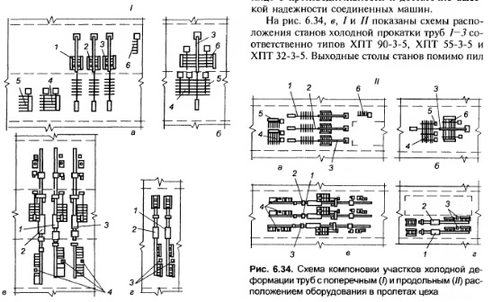 Участки холодной деформации трубДеформацию заготовки при производстве хо лоднодеформированных труб проводят в один или несколько циклов в зависимости от ее геометрических размеров, свойств используемого металла, способа деформации, размеров и требований к качеству готовых труб. В практике для осуществления деформации находят применение холодная (теплая) прокатка, волочение на неподвижной (короткой), подвижной (длинной) и самоус танавливающейся оправках, безоправочное и другие виды волочения, холодное редуцирование, а также сочетание этих способов. К основным достоинствам способа прокатки относятся: практически полное отсутствие потерь металла; возможность получения высоких обжатий по стенке (до 75—85 %) и по диаметру (до 65 %) трубы при применении конической или вогнутой оправки, что позволяет сократить до минимума цикличность деформации; значительное снижение разностенности и допусков по толщине стенки трубы вследствие применения высоких обжатий; возможность использования толстостенных исходных заготовок и получения широкого сортамента готовых труб из небольшого числа типоразмеров трубных заготовок; высокое качество наружной поверхности труб (без продольных рисок, являющихся характерным видом брака при волочении). Прокатку широко применяют для изготовления холоднодеформированных труб из высоколегированных (коррозионностойких, жаростойких, труднодеформируемых), легированных и углеродистых сталей и сплавов. В нашей стране холодная (теплая) прокатка является одним из основных способов изготовления тонкостенных труб из углеродистых, низколегированных и нержавеющих сталей, толстостенных и особотолстостенных труб с точным внутренним каналом для установок высокого давления, паро перегревательных труб для энергетических блоков большой мощности, труб высокой точности для нужд машиностроения, профильных труб, труб переменного сечения по длине и др.
