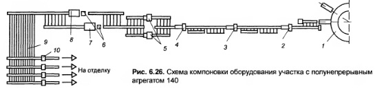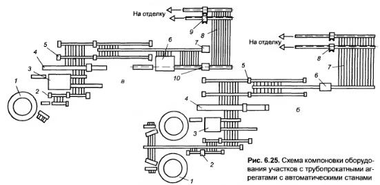 Оборудование агрегата расположено каскадно: каждый последующий стан находится на более низкой отметке, а трубы от одного стана к другому перекатываются по наклонным стеллажам. На больших и иногда средних агрегатах (рис 6.25, б) устанавливают две нагревательные печи 1 и два прошивных стана Д работающих последовательно. По конструкции оба прошивных стана одинаковы, но по характеру деформации различны: если первый прошивает заготовку в толстостенную гильзу, то второй выполняет функцию раскатного станаэлонгатора. Такая схема расположения оборудования на больших агрегатах позволяет получать тонкостенные гильзы, обеспечивая одновременно высокую производительность установки и высокую точность прокатываемых труб. Схема дает возможность также использовать любой прошивной стан при прошивке в одну операцию (для труб диаметром < 200 мм). При этом путь заготовки от каждой печи до прошивного стана получается практически одинаковым, что обеспечивает стабильность температуры при прошивке. В состав этого агрегата также входят подогревательная печь 3, автоматический стан 4, два раскатных стана 5, калибровочный стан 6, два правильных стана 8, охладительный стол 7. Техническая характеристика некоторых трубопрокатных агрегатов с автоматическими станами приведена в табл. 6.12. В связи с увеличением мощности печных агрегатов и усовершенствованием конструкций прошивных станов исчезла необходимость в дополнительных нагревательных и деформирующих агрегатах. В частности, в Японии на заводе в Кеб хине на агрегате с автоматическим станом установлена одна кольцевая печь и один прошивной стан. В цехах с современными трубопрокатными агрегатами 140 полунепрерывного типа конструкции ВНИИметмаш и ЭЗТМ все оборудование на участке горячей прокатки расположено в технологической линии по ходу трубы в следующей последовательности (рис. 6.26): нагревательная кольцевая печь 7, прошивной стан 2, первая 3 и вторая 4 клети полунепрерывного стана, два раскатных стана 5, индукционные подогревательные печи 6, калибровочный 7 и редукционный 8 станы, охладительный стол 9 и правильные станы 10. Такая схема по сравнению с традиционными агрегатами с автоматическими станами позволила исключить необходимость двухкратной обработки труб в одной клети автоматического стана и сократить поперечные передачи металла. В результате производительность агрегата возросла почти вдвое.