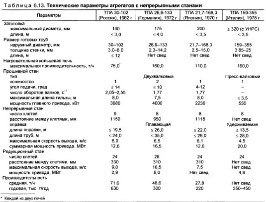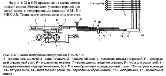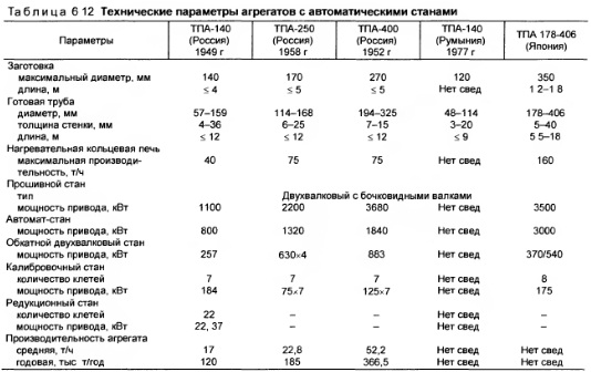 На участках горячей прокатки трубопрокатных цехов, оборудованных современными трубопрокатными агрегатами с пилигримовым станом среднего и большого типоразмеров, расположены: механизированные нагревательные печи, установка для гидросбива окалины, прошивной пресс, печь для подогрева стаканов, станэлон гатор, пилигримовые клети с подающими аппаратами и устройством для внестановой зарядки дорнов, устройства порезки труб, подогревательная печь, многоклетевые калибровочный и редукционный станы, охладительный стол и правильные станы. На установках малого типоразмера дополнительно к перечисленному оборудованию устанавливают пресс для калибровки исходной заготовки. Оснащение участков горячей прокатки комплексом оборудования для предварительной прошивки слитков в толстостенный стакан и его последующей прокатки в гильзу, а также мощными редукционными станами значительно расширило технологические возможности трубопрокатных агрегатов с пилигримовыми станами Техническая характеристика некоторых трубопрокатных агрегатов с пилигримовыми станами: