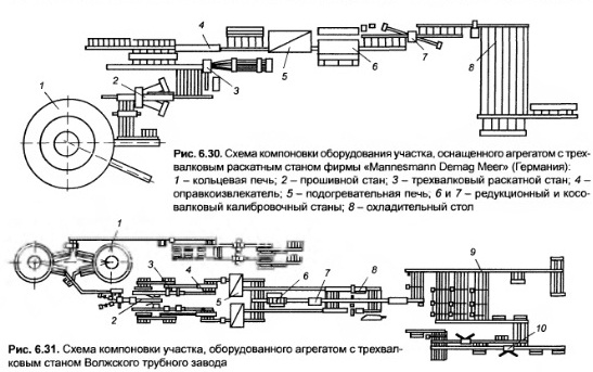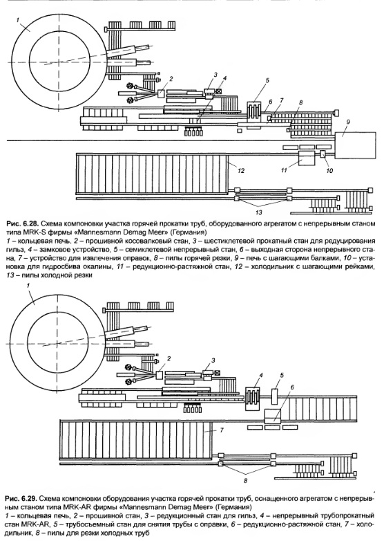 Характерной особенностью компоновки этих агрегатов является размещение склада слитков, нагревательных печей и печей для подогрева гильз прошивных прессов и станов, станов пилигри мовой прокатки, складов инструмента и насосноаккумуляторных станций в поперечных про летах цеха, а оборудования для горячей и холодной отделки труб — в продольных пролетах. Такая компоновка в большинстве случаев позволяет наиболее удобно сочетать технологические особенности процесса и рационально использовать производственные площади здания. Современные трубопрокатные агрегаты, включающие непрерывный стан, разнятся составом оборудования и особенно конструкцией отдельных станов и механизмов, степенью механизации и автоматизации. Однако всем присущ следующий общий признак: наличие многоклетевого редукционнорастяжного стана и индивидуального привода клетей непрерывного длинноопра вочного стана. Именно эти особенности позволяют прокатывать на современных агрегатах с непрерывным станом трубы всего сортамента длиной до 120 м из заготовки, гильзы и черновой трубы постоянных диаметров Уменьшение числа перевалок и перестроек, а также более полное использование механического и электрического оборудования (поскольку во всех случаях прокатываются черновые трубы максимального сечения) позволило резко повысить производительность современных агрегатов с непрерывным станом по сравнению с производительностью старых установок такого типа и других типов установок для получения труб аналогичного сортамента. Эти же особенности (наличие в переделе труб большой длины, высокий темп работы агрегата, особенности работы и циркуляции оправок, высокая энергоемкость) накладывают определенные условия и на компоновку этого участка цеха. Схема компоновки оборудования участка горячей прокатки на отечественном ТПА 30102 с непрерывным станом показана на рис. 6.27 В табл. 6.13 приведены некоторые технические параметры агрегатов с непрерывными станами На рис 6 28 и 6.29 представлены схемы компоновки и состав оборудования участков горячей прокатки цехов с непрерывными станами MRKS и MRKAR. Технические возможности этих агрегатов. Технологическое оборудование участков горячей прокатки большинства зарубежных цехов, оснащенных агрегатами с трехвалковым станом, а также цеха Волжского трубного завода показано на рис. 6.30 и 6.31 В комплексе трубопрокатного агрегата 200 Волжского трубного завода учтены недостатки отечественных агрегатов такого типа, работающих на Первоуральском новотрубном и Волжском трубном заводах. В состав агрегата введены, кольцевые печи ], прошивной стан 2, два параллельно установленных трехвалковых раскатных стана 3 с двумя отдельными оправкоизвлекателями 4, две подогревательные печи 5, один калибровочноредукционный стан 6, индукционный подогреватель 7, два калибровочных косовалковых стана 8, охладительный стол 9 и правильные станы 10 Такая схема позволяет повысить производитель ность трубопрокатного агрегата с трехвалковым раскатным станом почти вдвое по сравнению со старыми агрегатами. При этой компоновке все электротехнические помещения, маслоподвалы и т.п. расположены в технических подвалах, сооруженных под агрегатом. Так как основные станы агрегата прошивной, раскатной и калибровочные являются станами винтовой прокатки, к прокатке тру