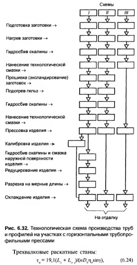 Участки производства бесшовных трубДля изготовления бесшовных горячедеформи рованных труб устанавливают печи для нагрева и подогрева металла, прошивные станы или прессы и станыудлинители, станы или прессы для раскатки гильз в трубу и комплекс оборудования для окончательного формирования диаметра и толщины стенки труб. В едином потоке с оборудованием для производства труб может устанавливаться, если это целесообразно, оборудование отделки. Исходную заготовку нагревают в газовых (кольцевых, карусельных, секционных) и индукционных печах. Для подогрева гильз и труб используют газовые печи с шагающими балками, секционные, карусельные и кольцевые, а также индукционные печи. Применяемые в ряде старых трубных цехов методические перекатные (роликовые) печи теперь уже не строят, а старые заменяют печами указанных выше типов. Это вызвано существенными недостатками конструкций методических и камерных печей (высокий процент угара, трудоемкость операций кантовки заготовок и труб, неравномерный нагрев металла и др.). На практике для превращения нагретой сплошной заготовки в полую гильзу применяют прошивные станы с бочковидными, дисковыми и грибовидными валками, комбинацию прошивки на прессе и становэлонгаторов, представляющих собой станы винтовой прокатки, сочетание станов прессвалковой прошивки со станамиэлон гаторами, а также прошивные прессы. В практике трубного производства наибольшее распространение получили станы с бочковидными валками. Дисковые прошивные станы в нашей стране не получили широкого распространения (их применяют на агрегатах 140 старого типа). Станы с грибовидными валками отечественной конструкции используют в составе полунепрерывных станов 140 конструкции ВНИИ метмаш и ЭЗТМ, их применение обеспечивает получение высококачественных гильз. С ростом производительности трубопрокатных агрегатов одной из актуальных задач становится интенсификация процесса прошивки. Было проведено много исследовательских и конструкторских работ по совершенствованию процесса прошивки и оборудования для его осуществления. До недавнего времени винтовую прокатку вели при углах подачи до 12°. Однако в ряде исследований, в частности проведенных под руководством проф., докт. техн. наук И. Н. Потапова, была доказана возможность значительного повышения скорости прошивки за счет увеличения угла подачи до 15° и более без увеличения или даже при некотором уменьшении числа оборотов валков. Применение на прошивных станах осевой выдачи гильз вместо боковой позволяет значительно сократить продолжительность вспомогательных операций и повысить тем самым производительность станов. Внедрение указанных и других усовершенствований на современных трубопрокатных агрегатах позволило повысить производительность прошивных станов в 1,5—2,0 раза. На ряде зарубежных агрегатов для сокращения числа типоразмеров заготовок устанавливают станы для продольной прокатки гильзы без оправки в шести или восьмиклетевом трехвалковом редукционном стане с групповым приводом валков от двигателя переменного тока. Использование таких станов обеспечивает без дополнительного подогрева суммарную деформацию по диаметру до 20—26 % без ухудшения качества наружной и внутренней поверхности гильзы. В частности, для одного из трубопрокатных агрегатов созд