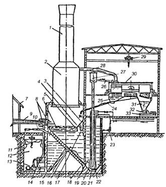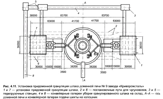 УСТАНОВКА ПРИДОМЕННОЙ ГРАНУЛЯЦИИ ШЛАКАНа производительность современных доменных печей весьма влияет своевременность уборки продуктов плавки — чугуна и шлака Уборка шлака в ковшах емкостью 11 — 16,5 м3 стала серьезным препятствием увеличения полезного объема доменных печей и роста производства чугуна Поэтому уборку и переработку шлака предусматривают на установках придоменной грануляции с получением строительного материала — гранулированного шлака Установка грануляции шлака при доменной печи № 9 объемом 5000 м3 «Криворожстали», введенной в эксплуатацию в 1974 г (рис 4 11), спроектирована в виде двух независимых сблокированных технологических линий (рабочей и резервной), каждая из линий рассчитана на переработку всего количества шлака, поступающего на нее от доменной печи в режиме выпусков продуктов плавки Поскольку печь оборудована четырьмя летками для чугуна, предусмотрен выпуск шлака на две стороны литейного двора, печь оснащена двумя установками, каждая из которых имеет узлы грануляции, обеспечивающие взры вобезопасность процесса даже при значительном содержании в шлаке чугуна Нормальные санитарногигиенические условия труда на рабочих местах и в районе доменной печи обеспечиваются грануляцией в специальном закрытом бункере под небольшим разрежением, создаваемым естественной тягой в вытяжной трубе Каждая технологическая линия имеет свой оборотный цикл водоснабжения В качестве обезвоживающего устройства используются вращающиеся фильтры Технологическая схема установки грануляции шлака показана на рис 4 12 Ее основные узлы бункеротстойник 16, постоянно заполненный водой до установленной отметки и соединенный вверху с вытяжной трубой L насосная станция 12 для подачи воды на грануляцию с камерой 15 оборотной воды, гранулятор 8, эрлифт (с камерой 19, воздухо 20, водо 22 и подъемной 21 трубами) для перекачки шлаковой пульпы, карусельный фильтр 30 для обезвоживания гранулированного шлака, промежуточный бункер 31. питатель 32, конвейер 33 отгрузки гранулированного шлака ![]()