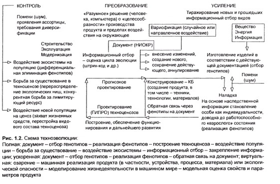 УЗЛОВЫЕ ТОЧКИ НАУЧНО - ТЕХНИЧЕСКОГО ПРОГРЕССАЦикл глобальной эволюции техники и технологии (техноэволюции) в индустриальную и постиндустриальную эпохи можно представить в виде кибернетической схемы закона информационного отбора (рис. 1.2). Цикл можно рассматривать начиная с любого этапа. По традиции началом считается какое-либо открытие, завершающееся научно-исследовательскими и опытно-конструкторскими работами (НИОКР) по созданию новой материальной и нематериальной продукции — изделий, включая виртуальные их формы. В частности, это могут быть новые виды техники, технологий, материалов или изобретательская инженерная деятельность. В результате рож-дается документ на изделие. Назовем конструированием этап создания документации на изделие (в том числе и на создание единицы техники в целом). Состав и объем конструкторской документации оговорен системой стандартов ЕСКД. При конструировании устанавливаются следующие виды изделий: детали, сборочные единицы, комплексы, комплекты. Конструкторские документы подразделяются на: чертежи деталей, схемы, спецификации, ведомости (спецификаций, сложных документов, покупных изделий, согласований применения покупных изделий, держателей подлинников, технического предложения, эскизного проекта, технического проекта), пояснительную записку, технические условия, программу и методику испытаний, таблицы, расчет, эксплуатационные, ремонтные документы, патентный формуляр, карту технического уровня и качества изделия, инструкции.