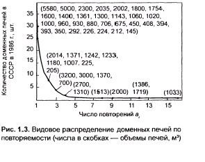 следствий научно-технической революции. Есть несколько причин этого явления, называемого вариофикацией. Что касается диверсификации производства, то это также неизбежный процесс, на который следует ориентироваться проектировщику при выборе техники, технологии, материалов, чтобы повысить эффективность предприятия в целом за счет увеличения разнообразия выпускаемой продукции, напрямую не относящейся к металлургической (выпуск холодильников Новолипецким металлургическим комбинатом). Диверсификация может быть связана с вариофикацией как инновация, а может быть и не связана с ней, если заимствовать технологию для выпуска известного продукта. Наконец, третья, совершенно независимая проблема — ассортица у потребителя. (На одном из трубных заводов в одном цехе насчитывалось 10 кранов одинаковой грузоподъемности и с одинаковыми пролетами семи заводов-изготовителей, поставивших разные редукторы, двигатели, пусковую аппаратуру.) Средняя повторяемость 100 тыс. двигателей, отремонтированных в черной металлургии, составляла 4,6. В черной металлургии СССР было задействовано 208 коксовых печей 94 видов, 171 агломашина 20 видов, 123 доменных печи 49 видов (рис. 1.3); 567 сталеразливочных агрегатов 126 видов и 360 прокатных станов 149 видов. Мы не рассматриваем здесь разнообразие (ассортицу), представление о котором дает кривая рис 1.3, а лишь констатируем факт. Согласно теории техноэволюции, соотношение элементов, образующих систему, увеличение разнообразия выпускаемого (варификация), сосредоточение разного в одном месте и времени — ассортица отражают одну и ту же закономерность. Первый ключевой вопрос - ассортица: все, что создается, появляется у потребителя, который делает оценку, отбор по-разному (скрытно, открыто), но каждый раз — преследуя свой личный интерес и реализуя закон информационного отбора, определяющий техноэволюцию: любой документ изменяется; видов создается больше, чем есть свободных ниш: изделия ведут борьбу за существование при ограниченности ресурсов; в процессе эксплуатации создается мнение. что изделие данного вида (техническое решение) лучше/хуже; незакрепленная информация документируется и превращается в программу; документ утверждается и становится действующим для изготовления изделия.