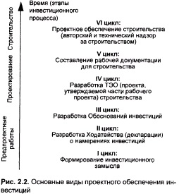 ЖИЗНЕННЫЙ ЦИКЛ ИНВЕСТИЦИОННОГО ПРОЕКТА И ЭТАПЫ ПРОЕКТИРОВАНИЯАнализ состава (этапов) проектирования и рассмотрение эволюции проектного дела позволяют сделать важный вывод, что в проектном обеспечении можно выделить нечто, отражающее мышление и деятельность человека и имеющее качественные особенности. Это нечто называют поразному: этап, стадия, цикл, фаза. В общем случае следует различать: Основные этапы проектного обеспечения инвестиций, включая предпроектную и проектную подготовку строительства, и соответствующие виды проектной деятельности установлены следующими нормативными и организационнометодическими документами Госстроя России: 1.СНиП 11-101—95. Инструкция о порядке разработки, согласования, утверждения и составе проектной документации на строительство предприятий, зданий и сооружений. 2.СП 11-101-95. Порядок разработки, согласования, утверждения и состав обоснований инвестиций в строительство предприятий, зданий и сооружений. 3.Типовое положение по разработке и составу Ходатайства (Декларации) о намерениях инвестирования в строительство предприятий, зданий и сооружений, утвержденное зам. министра строительства РФ 17 марта 1997 г. 4.Рекомендации по формированию инвестиционного замысла (целей инвестирования), одобренные письмом зам. министра строительства РФ от 13 марта 1997 г. N° 94/31. Основные виды проектного обеспечения инвестиций (названные циклами), установленные этими документами, приведены на рис. 2.2. Подчеркнем, что проектирование есть интеллектуальное обеспечение, интеллектуальный продукт, фиксируемый документально на каждом этапе инвестиционного процесса.