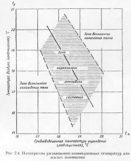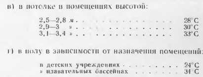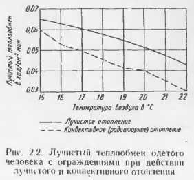 ГИГИЕНИЧЕСКИЕ ПРЕДПОСЫЛКИТепловой режим в помещении и теплоощущения человека зависят от теплозащитных качеств ограждающих конструкции и способов обогрева. Система отопления должна обеспечивать создание нормального температурного режима в отапливаемом помещении. Действующими нормами предусматривается создание в рабочей зоне температуры, обеспечивающей ощущение комфорта при различной интенсивности физической нагрузки. В жилых к общественных зданиях комфортной считается температура воз духа 18—20° С. На тепловые ощущения человека оказывает влияние не только и не столько температура воздуха, сколько температура внутренних поверхностей ограждающих конструкций. В связи с этим система обогрева помещения может оказывать решающее влияние па тепловые ощущения лиц, находящихся в отапливаемых помещениях. Следует иметь в виду, что при малой подвижности воздуха в помещении между телом и одеждой человека создается тепловая оболочка из малотеплопроводного воздушного слоя. При этом разность температур тела и воздуха уменьшается н несколько снижается теплоотдача организма. С увеличением подвижности воздуха тепловая оболочка становится тоньше, разность температур между телом и окружающей средой увеличивается, а это приводит к увеличению отдачи тепла организмом человека. Не менее важным фактором теплообмена является излучение телом человека на окружающие поверхности (наружные стены, окна н др.), пли так называемая «отрицательная радиация», в отличие от положительной радиации, когда тело воспринимает тепло от окружающей обстановки. Отрицательная радиация вызывает неприятные ощущения, в то время как восприятие лучистого тепла от умеренно нагретых поверхностей ощущается положительно. Поэтому необязательно, чтобы температура окружающих поверхностей была слишком высокой; гораздо важнее, чтобы она не была слишком низкой н не вызывала интенсивной отрицательной радиации. Таким образом, тепловой комфорт в помещении создается сочетанием температуры окружающей среды (воздуха), температурами внутренних поверхности внутренних и наружных осаждающих конструкций и величиной лучистых н конвективных тепловых потоков. Положительные значение систем панельно-лучистого отопления в гигиеническом отношении заключается в том, что вследствие преобладающего лучистого теплообмена в помещении температура внутренних поверхностей ограждающих конструкций выше, чем при конвективном отоплении, а это уменьшает отрицательную радиацию и позволяет несколько СНИЗИТЬ температуру воздуха и улучшить условия работы органов дыхания. Изучения условий внешней среды н физиологических реакций людей, проведенные при различных способах отопления в Ленинградском научно-исследовательском санитарно-гигиеническом институте (ЛНПСГИ) П. К. Пономаревой, показывают, что при лучистом отоплении наблюдается более равномерная температура воздуха, ограждений н предметов обстановки, чем при радиаторном. При этих исследованиях выявлена также меньшая интенсивность конвективных потоков воздуха при лучистом отоплении и снижение лучистого теплообмена человека с окружающей обстановкой (при радиаторном — 90,5; при лучистом — 76,4 ккал/ч при В=21°С). В результате проведенной работы Н. К. Пономарева отмечает, что: «Помещения с лучистым отоплением можно в холодное