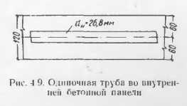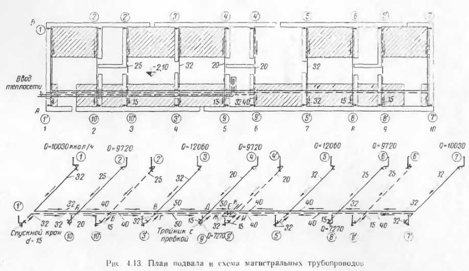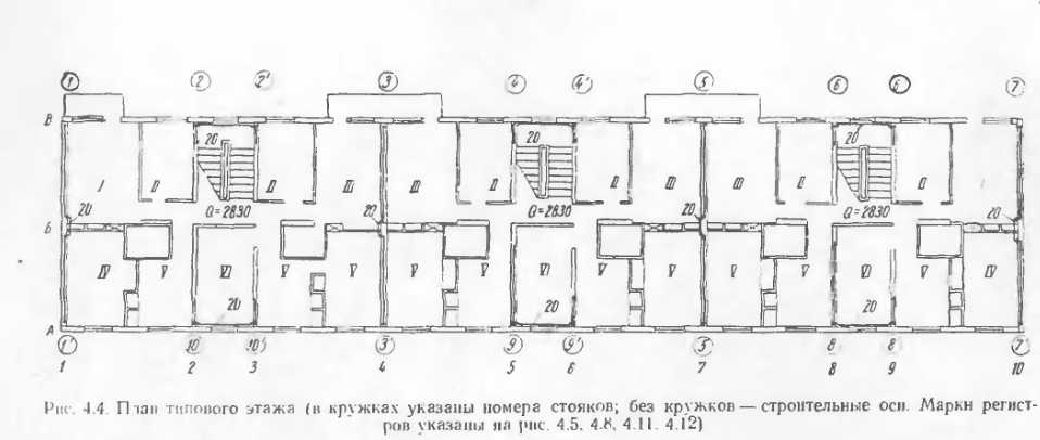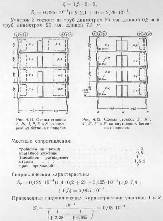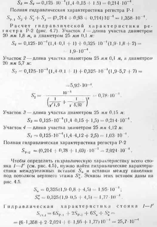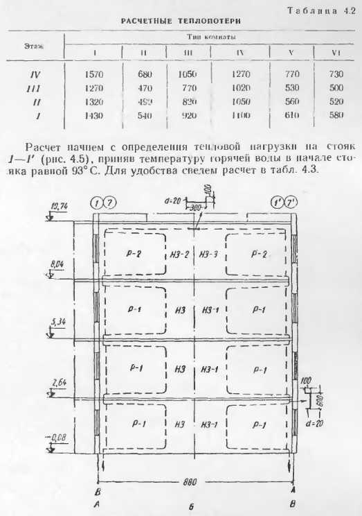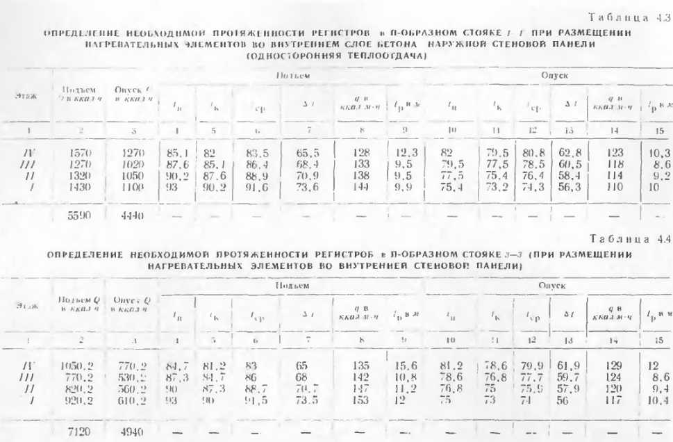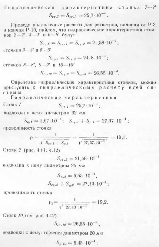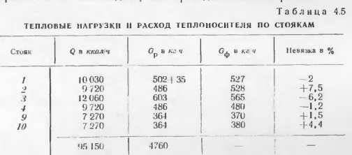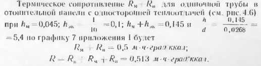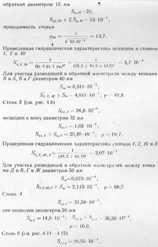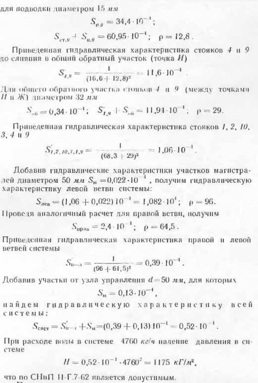 ПРИМЕР ТЕПЛОГИДРАВЛИЧЕСКОГО РАСЧЕТА СИСТЕМЫ КОНТУРНОГО ОТОПЛЕНИЯРассмотрим расчет тупиковой схемы отопления. Нагревательные элементы системы отопления в бетонных перегородочных панелях внутренних и наружных торцовых стен. Схема стояков П-образная. Расчетные для района с +31 С указаны в табл 4.2, а тины помещений обозначены римскими цифрами типовою (рис. 4.4) помещения обогреваются нагревательными элементами, заделанными во слой бетона наружных панелей торцовых стен. ![]() ![]() ![]() ![]() Определим протяженность регистров, заложенных во внутреннюю (рис. 4.8) бетонную стену толщиной 120 мм (стояк 3—3). При определении тепловой нагрузки на стояк следует помнить, что он обогревает смежные комнаты. Расчет сведен в табл. 4 4 Суммарная тепловая нагрузка на стояк QCT=I2 060 ккал/ч. Расчетный расход воды по стояку С = 603 кг/ч. Заполняем графы 4, 5, 6, 7, 10, II, 12 и 13 табл. 4.4. В каждую ветвь регистра поступит 302 кг/ч воды, при этом в = 0,011 м- ч- град/ккал. Термическое сопротивление RM для одиночной трубы в панели с двухсторонней теплоотдачей находим по графику рве. 8 приложения I, учитывая, что (рис. 4.9): ![]() ![]() ![]() ![]() ![]() ![]() ![]() ![]() ![]() ![]() ![]() ![]() ![]() ![]() В табл. 4.5 приведены тепловые нагрузки по стоякам, расчетные и фактические количества теплоносителя, затекающие в стояки левой ветви системы отопления. Как видно из этой таблицы, в стояк 3 поступает теплоносителя на 0,2% меньше расчетного. Чтобы выявить, как это может отразиться на теплоотдаче, был проведен тепловой расчет. ![]() Из этого расчет и видно, что при уменьшении расхода тепло носителя но стояку на 6,2% теплоотдача стояка снизилась па 1%. Следовательно, найденные расчетом расходы теплоносителя по стоякам можно считать окончательными, так как даже без тепловой регулировки системы будет обеспечена необходимая теплоотдача в отапливаемые помещения. Шаповалов И.С. ПРОЭКТИРОВАНИЕ ПАНЕЛЬНО-ЛУЧИСТОГО ОТОПЛЕНИЯ — М.: Стройиздат, 1966. |
