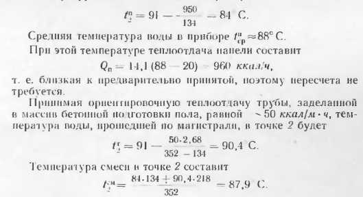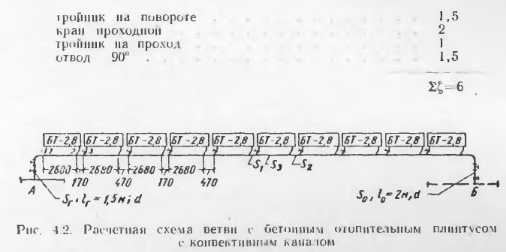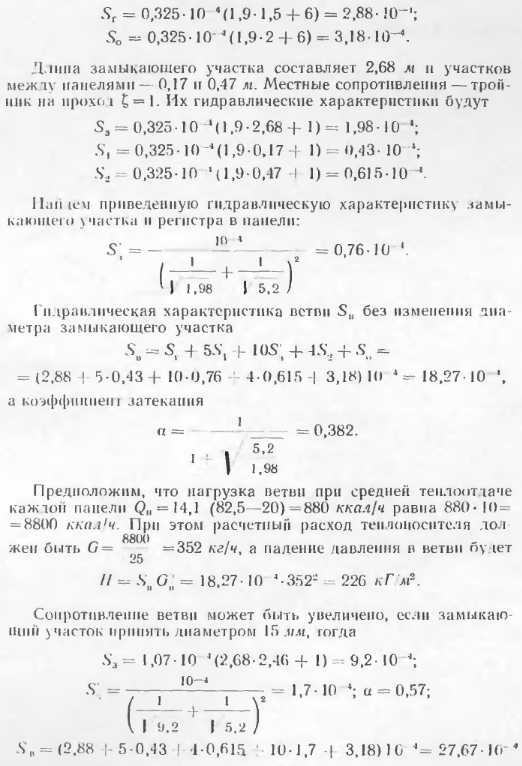 ПРИМЕР ГИДРАВЛИЧЕСКОГО И ТЕПЛОВОГО РАСЧЕТОВ ОДНОТРУБНОЙ ГОРИЗОНТАЛЬНОЙ ВЕТВИ СИСТЕМЫ С БЕТОННЫМИ ОТОПИТЕЛЬНЫМИ ПЛИНТУСАМИ, ИМЕЮЩИМИ КОНВЕКТИВНЫЙ КАНАЛРасчетная схема ветви приведена на рис. 4.2. Как было найдено в п. 5 главы 3, гидравлическая характеристика регистра вместе с подводкой от магистрали составляет ![]() Найдем гидравлическую характеристику всей ветви. Участки oi подающей магистрали до первого прибора 5Г и от последнею прибора до обратной Sa диаметром 20 мм имеют местные сопротивления: ![]() ![]() ![]() Аналогично находят гидравлические характеристики всех ветвей и увязывают все кольца. Изменяя диаметры d, н dot обычно легко подбирают необходимые сопротивления ветвей. Тепловой расчет магистралей и открытых трубопроводов производят по обычным формулам и таблицам теплоотдачи труб. Далее покажем расчет теплоотдачи панелей. Допустим, что (в результате теплового расчета магистралей) температура воды в точке 1 (рис. 4.2) составляет 91 С. Тогда, приняв ориентировочную теплоотдачу панели Q„=950 ккал/ч, температура в точке 2 может быть образом. ![]() В результате теплового расчета уточняется теплоотдача панелей и проверяется соответствие предварительно подобранных (в процессе конструирования системы) поверхностей нагрева теплопотерям помещении. Шаповалов И.С. ПРОЭКТИРОВАНИЕ ПАНЕЛЬНО-ЛУЧИСТОГО ОТОПЛЕНИЯ — М.: Стройиздат, 1966. |