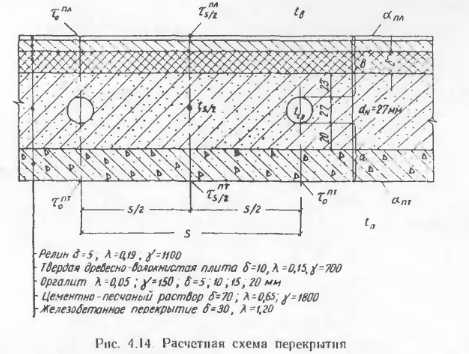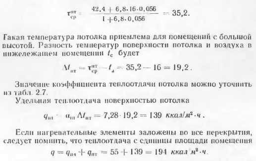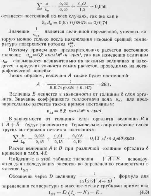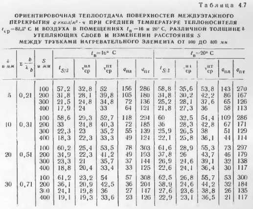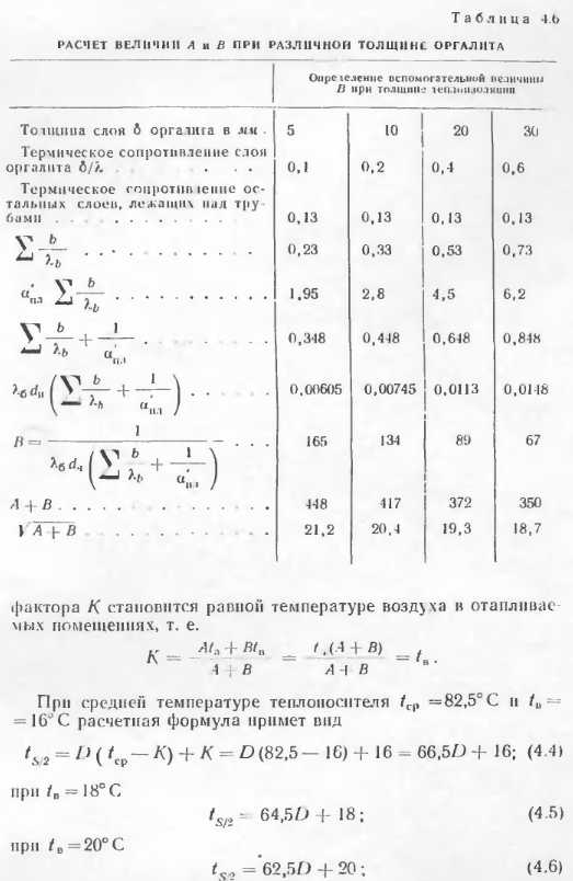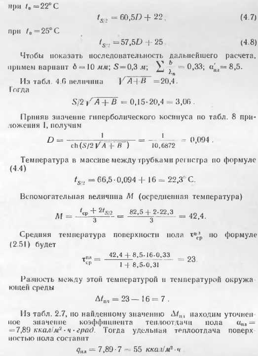 ПРИМЕР ТЕПЛОВОГО РАСЧЕТА ПОТОЛОЧНОНАПОЛЬНОГО ОТОПЛЕНИЯСтолкнувшись впервые с расчетом систем потолочно-напольного отопления, трудно уловить закономерности и последствия, к которым ведут изменении отдельных расчетных параметров. ![]() Чтобы несколько облегчить на первых порах решение конкретных задач, пример расчета теплоотдача пола и потолка. Расчетную схему перекрытия, разработанного Институтом общественных зданий (НПИОЗ) Академии строительства и архитектуры СССР, см. па рис. 4-14. Теплоотдача труб используется наиболее эффективно, если они замоноличенны в слон, обладающий высоким коэффициентом теплопроводности. Обычно регистры из труб заделывают в слон бетона или железобетона. В расчетной схеме принят менее благоприятный в теплотехническом отношении, по более дешевый в строительстве способ заделки труб в слой цементно-песчаного раствора с Я = = 0,65 ккал/м • ч • град. Найдем определяющие величины А по формуле (2.36) и В по формуле (2.37). ![]() ![]() ![]() ![]() Основные данные, полученные в приведенном выше расчете, можно найти в строке 7 табл. 4.7. Остальные данные этой таблицы получены путем аналогичных расчетов. Таблица приведена, чтобы показать, как изменение конструкции перекрытия влияет на температуру и теплоотдачу поверхностей пола и потолка. Это может облегчить работу па начальных стадиях проектирования. На основании данных этой таблицы можно сделать еле дующие выводы. 1. При увеличении толщины изоляции б, размещаемой над регистром, существенно понижается средняя температура пола т1 и несколько увеличивается средняя температура потолка т , причем эти изменения происходят наиболее резко при малых 5 2. При увеличении толщины изоляции в несколько снижается общая теплоотдача перекрытия, которая более существенно изменяется при малых 5. 3. Увеличение расстояния между трубками регистра 5 не дает снижения теплоотдачи. При увеличении расстояния в 4 раза теплоотдача уменьшается в 2,5 раза. Следовательно, если теплоотдающая поверхность достаточно велика, целесообразно с точки зрения экономии металла увеличивать расстояние между трубками. 4. С изменением 5 значительно изменяется температура, поэтому при подсчете теплоотдачи поверхностей необходимо уточнить значения коэффициентов теплоотдачи брать их из табл. 2.7. ![]() Следует отметить, что снижение параметров теплоносителя /ср вызывает примерно равное снижение теплоотдачи поверхностен, а повышение внутренней температуры в отапливаемых помещениях /„ (при неизменных параметрах теплоносителя ср и конструктивных размерах S, b, d) приводит к увеличению температур t, но снижает теплоотдачу этих поверхностен. Табл. 4.7 дает достаточно наглядное представление о динамике качественных тср и количественных q изменений в зависимости от изменения расчетных параметров S, tu и о. Следует отметить, что при данной конструкции перекрытия (см. вариант 6 = 20 мм) не удается получить на поверхности потолка TJ(=30°C. Следовательно, для понижения температуры па поверхности потолка придется между плитой перекрытия и слоем бетона, в который замоноличивают отопительные регистры, заложить слон утеплителя. Это даст возможность понизить тЦ и несколько повысить В связи с тем что укладка теплоизоляции между плитой перекрытия и слоем бетона вносит конструктивные осложнения, влечет непроизводительный расход теплоизоля