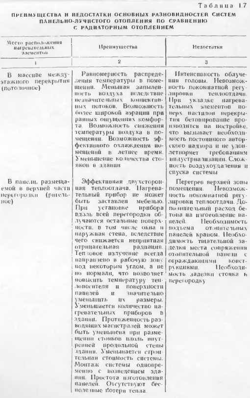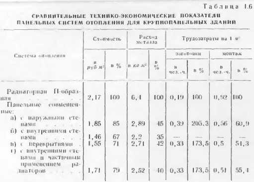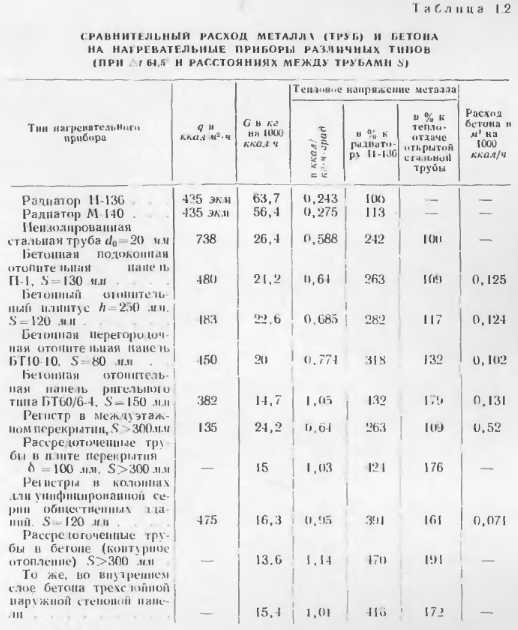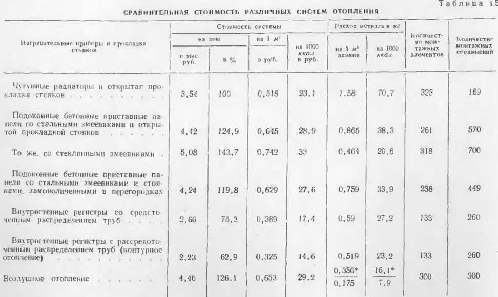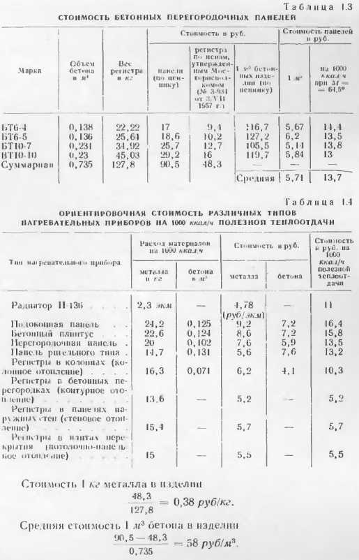 СРАВНИТЕЛЬНЫЕ ТЕХНИКО-ЭКОНОМИЧЕСКИЕ ДАННЫЕ СИСТЕМВ системах радиаторного отопления расход металла на трубопроводы составляет 30%, а па радиаторы — 70%. Поэтому в целях снижения металлоемкости систем водяного отопления основные усилия специалистов были направлены па уменьшение расхода металла на нагревательные приборы. Стоимость бетон пых отопительных панелей на период освоения производства их промышленными предприятиями неоправданно завышается, что существенно снижает общие технико-экономические показатели систем панельного отопления. Несмотря на это, некоторые разновидности систем панельно-лучистого отопления по стоимости устройства вполне конкурентоспособны с системами радиаторного отопления. Рассмотрим сравнительные технико-экономические показатели различных систем отопления. А. Металлоемкость нагревательных приборов и расход бетона Наиболее показательно сопоставление расхода металла па различные виды нагревательных приборов систем панельно-лучистого отопления с нагревательными элементами из стальных груб по сравнению с расходом его па обычные радиаторы и гладкие стальные трубы. В табл. 1.2 приведены данные удельной теплоотдачи прибора q в ккал/м2-ч при разности температур 5° и расход металла G в кг на 1000 ккал/ч полезной теплоотдачи прибора. Расход труб (металла) в системах потолочно-напольного отопления принят исходя из средних температур тр=25°С и тр 30°С, при этом удельная теплоотдача соответственно принята 55 и qT =80 ккаг/м2- ч. ![]() В. Ориентировочные данные стоимости различных систем ![]() Как видно из ориентировочных подсчетов, приведенных в табл. 14, при бетон стоимость бетонных отопительных панелей выше, чем чугунных радиаторов Это полностью относится к таким бетонным приборам, как подоконные панели и плинтусы. Несколько иначе обстоит дело с перегородочными отопительными панелями, которые заменяют в здании часть перегородок, имеющих довольно высокую стоимость (от 2,5 до 5 руб). Исключение части перегородок существенно снижает стоимость не только бетонных панелей, по и всей системы отопления (0 218 вместо 0,353 руб/м3 здания). Снижению стоимости панельного отопления с бетонными перегородочными панелями способствует также уменьшение количества устанавливаемых нагрева приборов, что сокращает затраты рабочей силы, число монтажных операций и расход регулировочных кранов (приблизительно па 40%). Технико- экономические преимущества бетонных перегородочных отопительных панелей явились основанием для применения их в типовых проектах крупноблочных и крупнопанельных зданий. Необходимо отметить, что в Москве на заводе № 7, который является основным поставщиком для московскою строительства, производство бетонных отопительных панелей с 1958 г. возросло с 7 до 30 тыс. шт. в год. Это позволило сэкономить на монтаже систем отопления только в Москве около 10 000 т металла, восполнить нехватку дефицитных радиаторов, снизить трудозатраты па монтаж (па 47%) н стоимость устройства систем отопления (на 30%). Значительный интерес представляют данные о стоимости различных систем отопления, весьма тщательно проанализированные отделом инженерною оборудования ЦПМПЭП жилища. Вполне закономерно, что наиболее экономичны системы панельного отопления с двухсторонней теплеют точенным распределением груб в бетонных ограждающих конструк