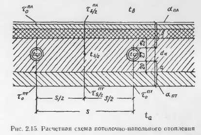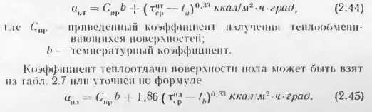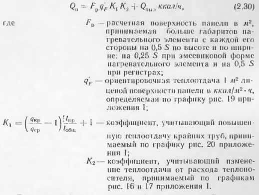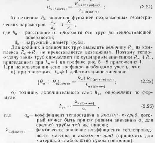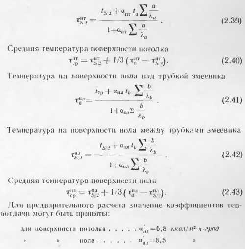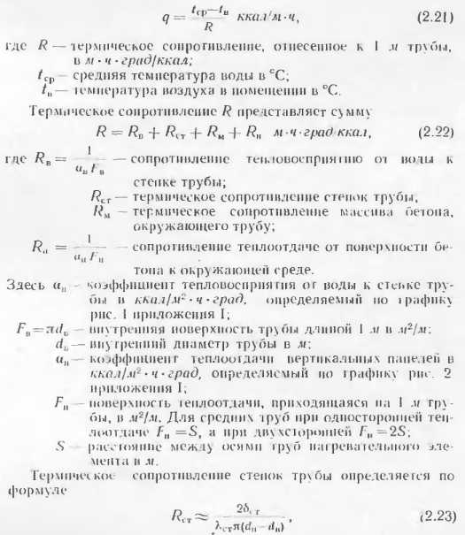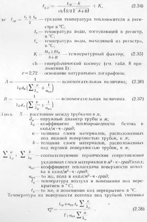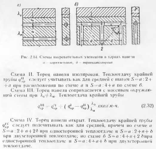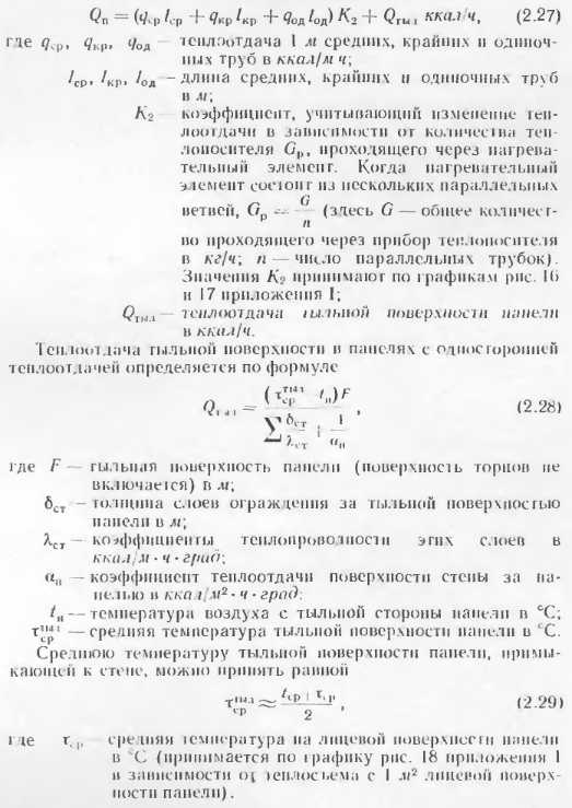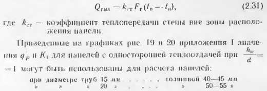 Тепловой расчет бетонных отопительных панелейВ приложениях приведены данные о теплоотдаче отдельных видов бетонных отопительных панелей, освоенных промышленностью и применяемых в строительстве. Эти панели испытывали в лабораториях, и данные о их теплоотдаче в достаточной степени достоверны. Однако приведенные типы панелей разрабатывались для зданий с определенными конструктивно планировочными схемами н при проектировании конкретных объектов могут оказаться неприемлемыми. В этих случаях разрабатывают новые конструкции бетонных отопительных панелей и теоретически определяют их теплоотдачу. Следует отмстить, что приведенные методики теоретического определения теплоотдачи панелей дают точность, достаточную для практических целей, однако когда возникает необходимость широкого применения какой-либо конструкции в массовом строительстве, то образцы панелей заводского изготовления следует проверять в лабораторных условиях. Такая проверка необходима для того, чтобы выявить фактическую теплоотдачу прибора, на которую влияют степень армирования, гранулометрический состав инертных, влажность бетона и другие факторы, не поддающиеся пока точному теоретическому расчету. Степень достоверности расчетов теплоотдачи и особо сложных случаях (одиночные трубы в массиве многослойных наружных стен при перекрытии) можно повысить, используя данные этих конструкции. А. Расчет теплоотдачи вертикальных бетонных отопительных панелей В тех случаях, когда применяют конструкции бетонных панелей, отличные о г приведенных в приложениях, а также при разработке тенлоотдающих бетонных ограждающих конструкций с рассредоточенным размещением нагревательных элементов их теплоотдача может быть подсчитана но методике, предложенной НИПСТ АСиА СССР (М. М Грудзинским и ![]() ![]() ![]() ![]() ![]() ![]() ![]() ![]() При расчете с конвективным канатом пользуются для расчета панелей с двухсторонней теплоотдачей, на полученную теплоотдачу обеих поверхностей понижающий коэффициент 0,85. Б. Расчет теплоотдачи горизонтальных отопительных панелей Для определения температуры па поверхностях пола и потолка наиболее простыми являются формулы Л II. Киссниа [5]. Основные расчетные точки, в которых определяются темпера туры, показаны на расчетной схеме (рнс. 2.15): ts., — в толще массива между трубками; т0—па поверхностях против трубок и т5, па поверхностях между трубками. ![]() Исходными данными для расчета являются параметры теплоносителя р, толщина б и теплопроводность материалов конструктивных слоев а и б, диаметр труб dn и расстояние между трубами 5. При расчете применяют следующие формулы. ![]() ![]() ![]() ![]() ![]() Следует иметь в виду, что метод приближенного расчета теплоотдачи горизонтальных панелей но формулам М И. Кнесина экспериментально проверен в лабораторных условиях при толщине потолочных панелей 150 мм с расстоянием меж ту гребками 5 = 80 : 200 мм. Расхождение между температурой отдельных точек панелей по опыту н расчету не превышает 1,5 —2 С. Поскольку в работе не сделано никаких оговорок в отношении пределов применимости формул, мы пользовались ими для решения различных задач. Однако при расчетов были обнаружены нарушения закономерностей. Поэтому мы считаем целесообразным до проведения соответствующих экспериментов ограничить применение приведенных выше формул для 