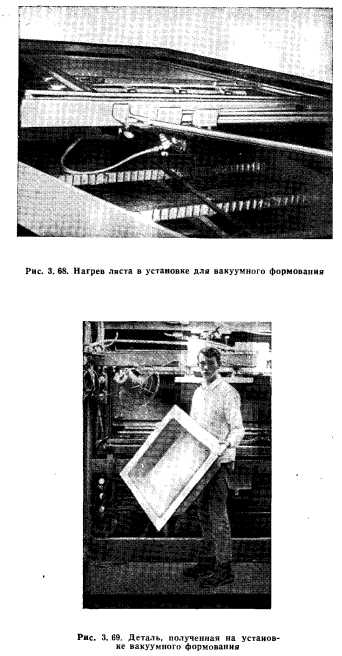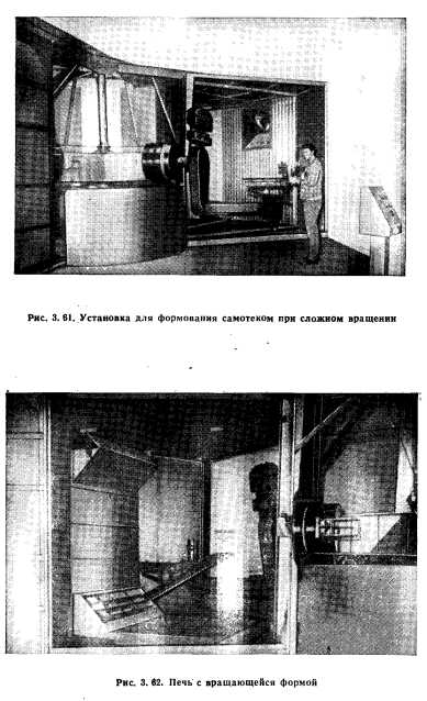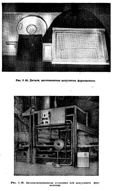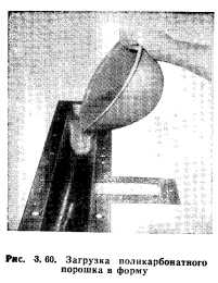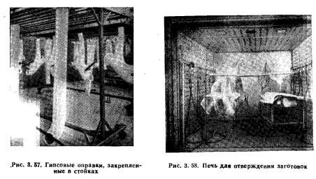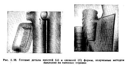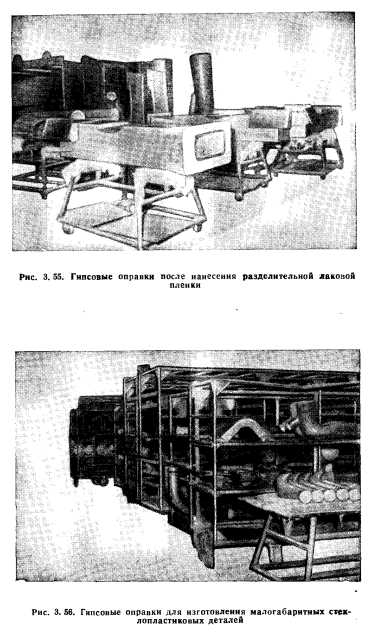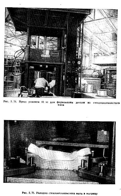 ФОРМОВАНИЕ ТРУБОПРОВОДОВ И ДРУГИХ ДЕТАЛЕЙ ИЗ НЕМЕТАЛЛИЧЕСКИХ МАТЕРИАЛОВПри изготовлении элементов трубопроводных систем и других деталей из неметаллических материалов в производстве самолета В-747 широко применяют различные способы формования: выкладка на оправки (гипсовые формы одноразового применения), формование при сложном вращении, вакуумное формование, прессование стекловолокнистого мата. ![]() Выкладка на оправки Методом выкладки на оправки получают стеклопластиковые детали сложных форм, не испытывающие силовых нагрузок, типа труб, воздуховодов, коллекторов, патрубков. При изготовлении оправок в специальном цехе в г. Оберне гипс со связующим заливают в разъемные формы, выполненные с высокой степенью точности из стеклопластика. Полное заполнение гипсомассы больших форм с толщиной стенок 25 мм обеспечивается вращением их в специальном приспособлении; при изготовлении же малогабаритных оправок эту операцию выполняют вручную. После отверждения гипсомассы оправку вынимают из формы и сушат в печи воздухом, нагретым до 50° С, в течение 24—48 ч до полного удаления из гипсомассы воды. Для герметизации и лучшего отделения гипсомассы от изготовленной детали на наружную поверхность оправки напыляют слой специального лака толщиной не менее 0,125 мм с последующей сушкой его на воздухе (рис. 3.55). На рис. 3.56, 3.57 показаны готовые оправки. В процессе изготовления детали на готовую оправку с большой тщательностью (во избежание образования пузырей, складок и других дефектов) выкладывают слои стеклоткани, пропитанной полиэфирной смолой (препрега) до получения требуемой толщины стенки. Препрег хранят в холодильнике при 7° С; перед выкладкой его нагревают до комнатной температуры. Раскрой стеклоткани и выкладку заготовок проводят вручную. Для улучшения условий формования в местах изгиба материала и стыковки используют паяльники и специальные утюги. ![]() ![]() Собранный комплект вместе с оправкой помещают в мешок из поливиниловой пленки и герметизируют его, затем с помощьюспециально присоединенных трубок откачивают из него воздух, обеспечивая вакуум —500 мм рт. ст. Мешки с заготовками для отверждения выдерживают в печи (рис. 3.58) при 120° С в течение 2,5 ч. После охлаждения оправку разрушают ударами резинового молотка. Для удаления остатков гипса и разделительной пленки деталь помещают в резервуар с горячей водой. Механическую обработку детали проводят высокоскоростной фасонной фрезой, режущая часть которой покрыта алмазным порошком. На получение готовой детали методом выкладки на оправку (рис. 3.59), по данным фирмы «Боинг», затрачивается в среднем 3 чел.-ч. Фирма считает, что в связи с незначительными расходами на изготовление оснастки этот метод наиболее экономичен при производстве небольших партий деталей или деталей сложной, формы. Формование при сложном вращении самотеком Метод формования при сложном вращении самотеком широко используют при изготовлении полых деталей неправильной формы, таких, например, как трубопроводы системы кондиционирования воздуха, выпускаемых большими партиями. Время изготовления этим методом одной трубы в среднем составляет 10 мин. На самолете В-747 для изготовления деталей трубопроводов формованием при сложном вращении самотеком используют в основном поликарбонат, применяются и другие материалы: найл