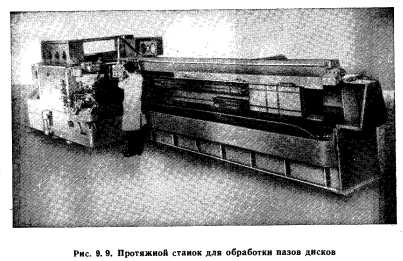 ПРОИЗВОДСТВО ДИСКОВДиск вентилятора двигателя RB-211 изготавливают из титанового сплава IMI658 следующего состава (в %): Ti —основа, 6— А1, 5 — Zr, 0,5 — Мо, 0,5—Si. Диски поставляет фирма «Империэл метал индастриз» механически обработанными. Предварительную обработку пазов елочного профиля проводят на заводе фирмы «Роллс-Ройс» фрезерованием, окончательную — протягиванием. Диски компрессора среднего и высокого давления двигателя КВ-211 выполнены из титанового сплава. Диск последней ступени выполнен из жаропрочного никелевого сплава. Такие же или аналогичные материалы использованы для дисков двигателей CF-6 и JT9-D. Так, последние ступени двигателя JT9-D делают из аустенитных сплавов «Инколой-901» и «Васполой». Штампованные заготовки дисков на заводы фирмы «Роллс- Ройс» поставляет фирма «Смит Клайтон Фордж» в обточенном и термообработанном виде. Токарная черновая и получистовая обработка дисков проводится на карусельных станках с программным управлением. ![]() Окончательную обработку дисков ведут на двусторонних гидрокопировальных станках фирмы «Хейлигенштадт» (ФРГ), причем копиры изготавливала сама фирма «Роллс-Ройс» на высокоточных станках с ЧПУ фирмы «Контимэтик». Фирма «Роллс-Ройс» для производства двигателя RB-211 заказала станкостроительной фирме «Тьюб инвестмент мэшин тул дивижн» (Англия) новый высокопроизводительный токарный станок с ЧПУ. За 18 месяцев фирма спроектировала и изготовила двусторонний станок [модели «Рэд Сенчюри 1250 NC» для обработки деталей типа дисков и колец из титановых и никелевых сплавов. Станок имеет магазин на 20 резцов, налаживаемых на размер вне станка. Продолжительность обработки по сравнению с однорезцовой сократилась примерно на 40%. Обработку пазов ведут методом протягивания на высокоскоростных горизонтальных станках фирмы «Ставели Лапойнт», обеспечивающих скорость резания до 30 м/мин. Ход станка — в зависимости от модели 6—10 м (рис. 9.9). Делительный поворот диска для обработки следующего паза — автоматический. Стойкость протяжек (весьма высокая)—до 50 дисков. Объясняется это, помимо оптимальных режимов резания, высоким качеством изготовления и заточки протяжек. Так, имеются специальные станки для заправки радиусов по профилю режущей кромки с заданным задним углом и подъемом на зуб. Фирма «Роллс-Ройс» сама делает протяжки и покупает их у фирмы «Лапойнт». Штампованные диски турбины из никелевого сплава «Нимоник» поставляет фирма «Хэнри Вигиненд корпорейшн». Исходные заготовки эта фирма получает в электрофлюсовой печи. Заготовку в виде плоского диска штампуют, а затем обтачивают с припуском на токарно-карусельных станках модели 16ДКЕ с программным управлением фирмы «Шесс». На фирме «Роллс-Ройс» турбинные диски проходят окончательную обработку. Для профилирования дисков турбины из труднообрабатываемых материалов создаются установки для электрохимической обработки. Две большие установки для этой цели были заказаны фирме «Ставели групп». Чертежами предусмотрено притупление острых кромок по контуру паза елочного профиля на торце диска до радиуса 0,2—0,4 мм. Специалисты фирмы «Дженерал электрик» считают, что при обработке дисков компрессора I ступени из сплава Ti—6А1—2Sn— Zr—2Мо целесообразно применять электрохимическое шлифование с последующей дробеструйной обработкой. Эта же фирма разработала 