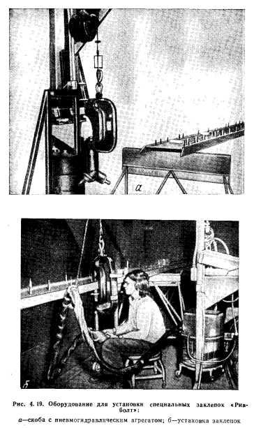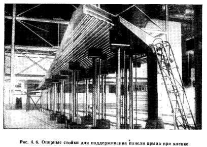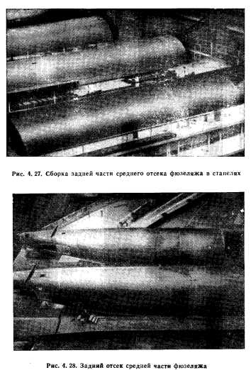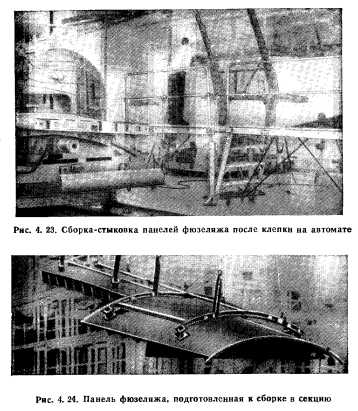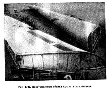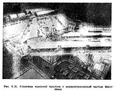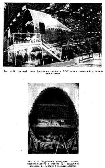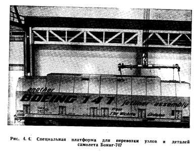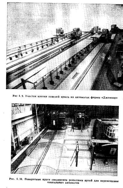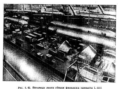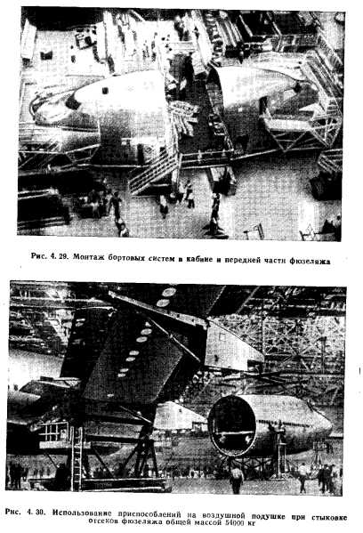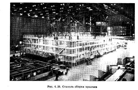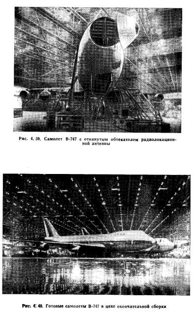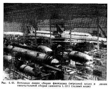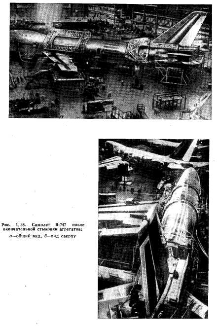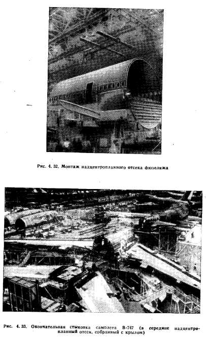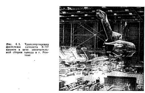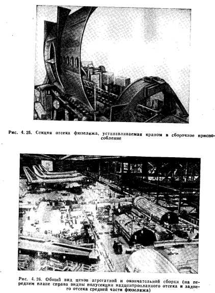 СБОРКА И КЛЕПКАРациональное членение конструкции широкофюзеляжных самолетов и хорошая взаимозаменяемость их элементов позволяют осуществлять сборку узлов и агрегатов самолетов как на самолетостроительных заводах, так и на заводах фирм-поставщиков с последующей окончательной сборкой самолета на сборочном заводе ведущей фирмы-изготовителя самолета. На фирме «Боинг» такой завод расположен в Г. Эверетте, в составе которого предусмотрен отдельный сборочный комплекс общей площадью 325 ООО м2. В сборочный комплекс входят цехи, в которых осуществляют узловую и агрегатную сборку крыла, сборку отсеков фюзеляжа из подсборок, изготавливаемых другими фирмами, а также стыковку всех агрегатов самолета, в том числе получаемых в собранном виде от суб- подрядчиков . Для доставки в г. Эверетт всех элементов самолета с друлих заводов корпорации, а также от фирм-поставщиков используют различные транспортные средства. Так, перевозку стрингеров крыла длиной 29—32 м осуществляют в контейнерах с помощью специального автотягача с прицепом. При длине груза более 40 м задняя тележка также управляется водителем. Секции панелей фюзеляжа доставляют в г. Эверетт из г. Вичиты (отделение фирмы «Боинг») на железнодорожной платформе. Такая платформа, закрытая двумя секциями щитов, для традамортароаки матери а- ло-в, деталей и узлов показана, на рис. 4.4 (>видны крановые захваты для удаления щитов). Как правило, крупногабаритные заготовки, узлы » агрегаты планера, прибывающие в вагонах по железной дороге, располагают не на складах, а в цехах завода с таким расчетом, чтобы свести до минимума погрузочно-разгрузочные и проверочные работы. ![]() Сборочные цехи длиной более 335 мм, шириной 90 м и высотой 23 м без верхних световых проемов, расположенные в корпусах модульной конструкции, имеют хорошую искусственную освещенность (по данным фирмы — от 320 до 800 лк/м2). В отдельных зонах, где выполняется большой объем ручных работ, предусмотрено индивидуальное управление освещением; обслуживание системы освещения -проводят со специальных крановых тележек, мостиков и т. п. Бетонированные полы производственных помещений покрыты в сборочных пролетах специальным покрытием и лаком что облегчает поддержание нужной чистоты помещений. При большой высоте производственных помещений верхнее пространство сборочных цехов занято подвесной рельсовой системой с кранами, оснащенными захватными устройствами, которые широко используют для транспортировки узлов, секций и агрегатов самолета в сборочное помещение (рис. 4.5). Грузоподъемность такой системы в цехе окончательной сборки в г. Эверетте достигает 54 тс. за счет стыковки двух кранов, грузоподъемность каждого- из которых 27 тс. Автоматическое управление грузотранспюртными системами ведут со специального пульта, расположенного на определенной высоте от пола. ![]() Периодичность подачи различных деталей, узлов и материалов со складов и сборочных участков увязана с графиком сборки и поставки самолетов. Применение автоматизированных транспортных систем в сборочных цехах, помимо удобства и мобильности перемещения различных грузов, освобождает производственные площади для организации поточных линий сборки узлов, агрегатов и самолета в целом, а также для рационального размещения большого количества сборочной оснастки —стапелей мо