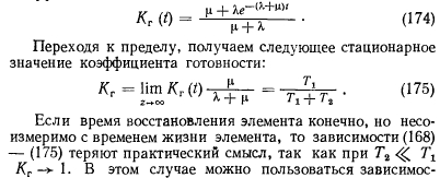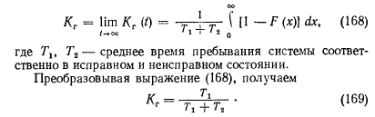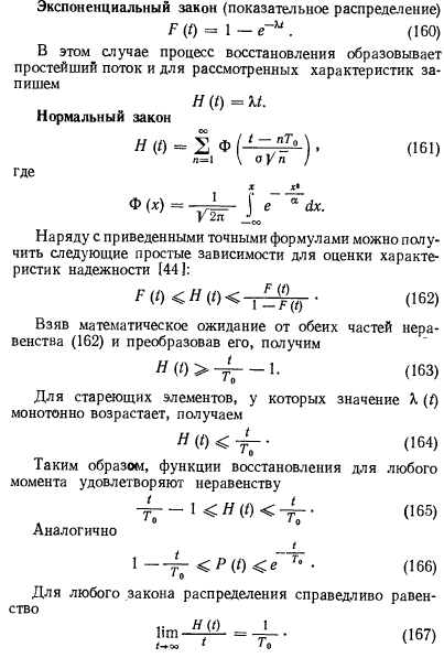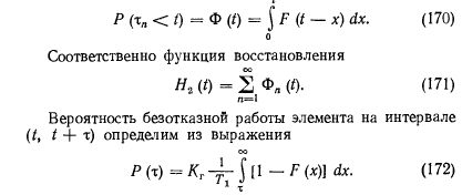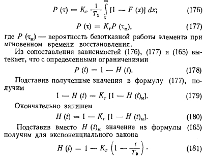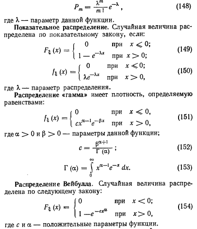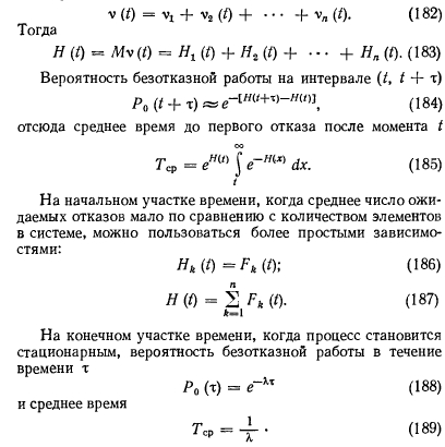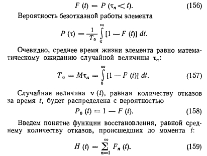 Определение количественных показателей надежности и эффективностиНадежность системы долго рассматривалась как качественная ее характеристика. По мере усложнения системы метод качественного анализа надежности все более и более входил в противоречие с растущими требованиями технологии их проектирования, изготовления и эксплуатации. Переход к количественному анализу надежности сложных систем требует учета большого количества разнообразных детерминированных и случайных факторов, всю совокупность которых можно оценить только с помощью аппарата теории вероятностей, теории случайных процессов и математической статистики. Надежность изделия обусловливается прежде всего его безотказностью и работоспособностью. Отказом является событие, заключающееся в нарушении работоспособности. Безотказность и количество отказов на заданном интервале времени элементов системы или самих систем, спроектированных, изготовленных и эксплуатируемых идентично, имеют значительный разброс. Такое положение можно объяснить влиянием случайных факторовна работоспособность системы. Поэтому функциональное состояние системы в произвольный момент времени можно определять как случайное. Чтобы охарактеризовать случайную величину, достаточно указать, какие значения их вероятности она может принимать. Указанный способ определения случайной величины приемлем, если она по условиям задачи может принимать конечное множество значений, однако количество таких задач весьма ограничено. Значительно чаще приходится сталкиваться с задачами, при решении которых значения случайных величин несчетны. В этом случае прибегают к использованию понятия функции распределения случайной величины, т. е. вероятности того, что I принимает значение меньше, чем х для любых действительных значений аргумента [44]: ![]() Распределение Пуассона. Случайная величина распределена по закону Пуассона, если она может принимать только неотрицательные целочисленные значения с вероятностями ![]() Рассмотренные выше распределения случайных величин приведены для простейшего потока, отличающегося отсутствием стационарности, последствия и ординарности. Стационарность означает, что вероятность появления v событий в течение промежутка времени от Т до Т + t не зависит от Т, а зависит только от v и /. Отсутствие последствия означает, что вероятность наступления событий в течение промежутка ТХТ + т не зависит от того, сколько раз и как появлялись события v ранее. Ординарность означает невозможность появления двух или более событий за малый промежуток времени т: ![]() Любое техническое устройство или схема состоят из элементов. Рассмотрим поведение элемента, представляя его жизнь из последовательных случайных переходов (из состояния функционирования в состояние отказа, далее в состояние восстановления и вновь в состояние функционирования). Такая картина наиболее близка к реализуемой в инженерных системах. Предположим, что восстановление происходит мгновенно. Элемент начал свою работу в момент / = 0, и, проработав случайное время тх, выходит из строя. В этот момент он мгновенно заменяется новым, который, проработав время т2, также выходит из строя и заменяется элементом с временем работы т3. Процесс продолжается неограниченно. Закон распределения случайных величин ![]() Опишем закон ра
