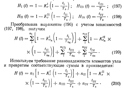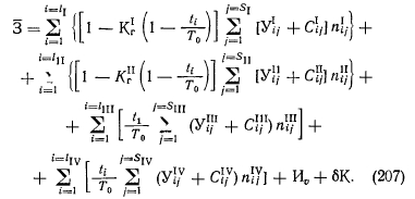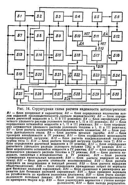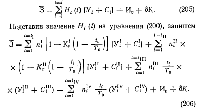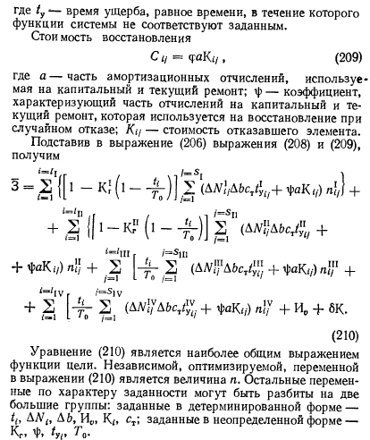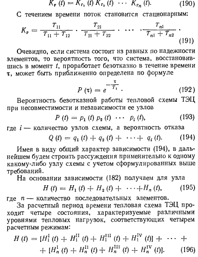 Так как функция восстановления численно равна среднему количеству отказов, происшедших до заданного момента времени, то выражение (200) количественно оценивает надежность рассматриваемого узла схемы. В качестве общего критерия для любых систем может быть принята полезность их использования в стоимостном выражении, определенная на основе количественных характеристик надежности. В энергетических системах полезность наиболее адекватна производительности (выработка тепла и электроэнергии). Связь между показателями надежности и эффективности может быть определена из выражения ![]() Очевидно, выражение (201) характеризует ожидаемые затраты на эксплуатацию системы за время Т и начальные капиталовложения, определяющие ее надежность. Из множества вариантов реализации системы предпочтение должно быть отдано той, у которой значение минимально. Выражение (201) является общим критерием полезности любой системы. Рассмотрим некоторые особенности этого выражения применительно к системам теплоснабжения, в качестве времени использования которой целесообразно принимать год ее жизни. За этот период система проходит некоторые состояния, отличающиеся координатами текущего времени, производительностью, режимом работы элементов, наличием или отсутствием плановых ремонтов, случайных отказов и восстановлений. Таким образом, фазовое пространство системы представляет собой совокупность точек, определяющих надежность системы в заданный момент времени. Так как полное состояние системы в произвольный момент времени зависит от многих переменных, то аналитически сложно описать траекторию движения системы в фазовом пространстве, учитывая, что на отдельных отрезках траектории параметры системы имеют детерминированное, стационарное значение. Поэтому целесообразно вычислять значение функционала на каждом из этих участков отдельно, суммируя затем полученные результаты: i=i ![]() Выражение (202) тождественно выражению для приведенных затрат, которые используются в энерго-экономических расчетах. Приведенные затраты с учетом вероятностного характера дополнительных издержек, связанных с характеристикой надежности системы, запишем на основании формулы (202) в виде ш ![]() В состав издержек производства, не связанных с надежностью, входят затраты на топливо, зарплату, амортизацию, общие и прочие. Пользуясь выражением (203), будем решать локальные задачи для однородных систем, вариантных в смысле количества элементов и их структурных связей. Выбор турбин в тепловых схемах ТЭЦ оптимизируется вне категорий теории надежности и для расчета тепловой схемы по условиям надежности должен быть задан. Заданное сочетание турбин и определяет ту локальную задачу, в рамках которой варьируются остальные узлы тепловой схемы. Набор всех заданных комбинаций турбин является полем поиска, которые, в свою очередь, есть детерминированный параметр фазового пространства системы. Эффективность всех остальных элементов системы, кроме турбин, не зависит от изменения тепловых нагрузок. Например, изменение производительности котлоагрегата или питательного насоса от 100 до 50% (от номинального значения) практически не влияет на относительный расход топлива в различных вариантах реализации тепловой схемы ТЭЦ. Таким образом, отпадает необходимость введения еще одной груп