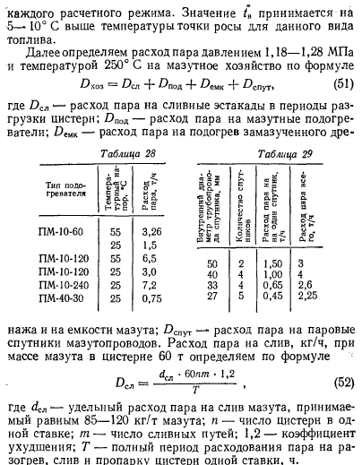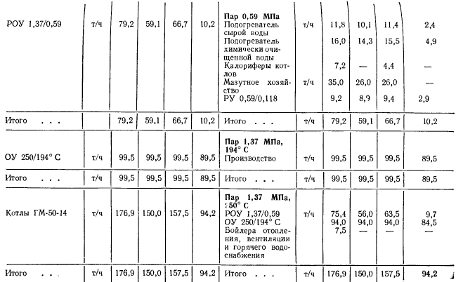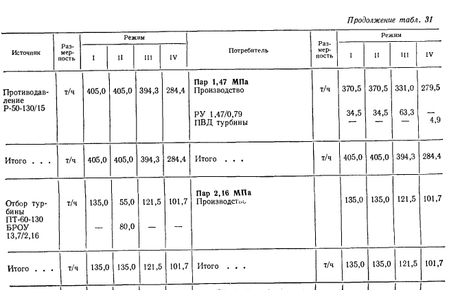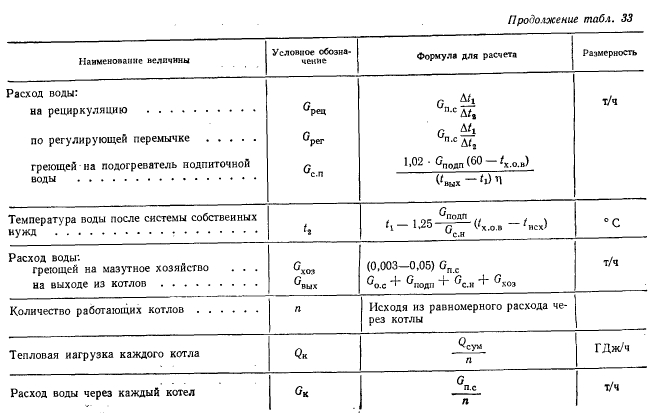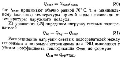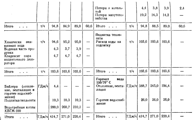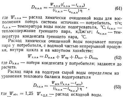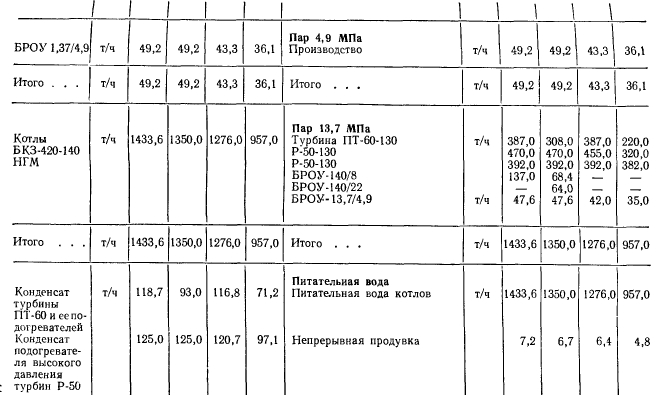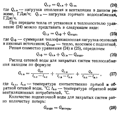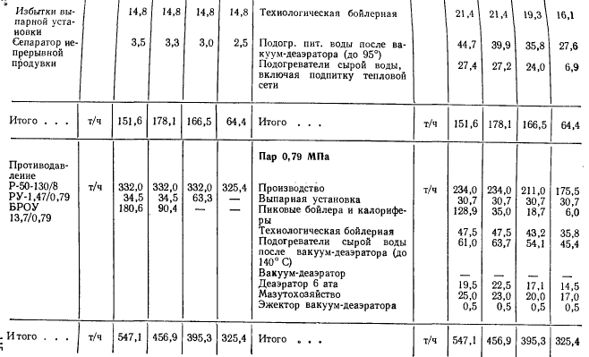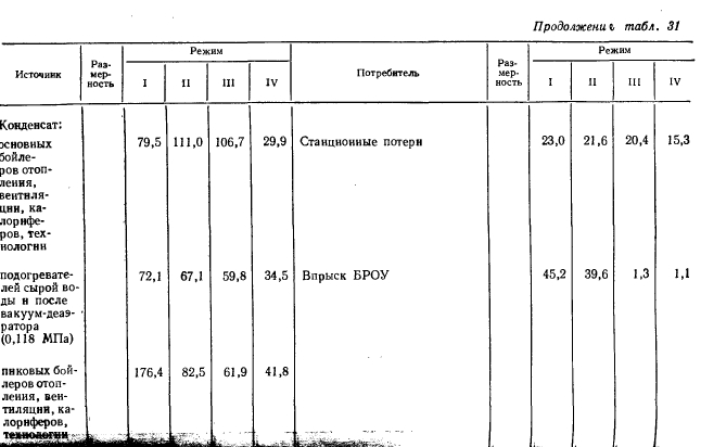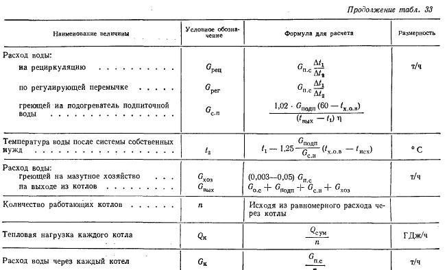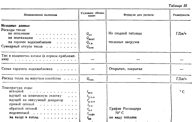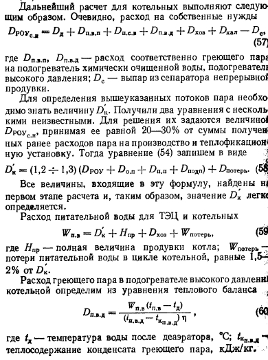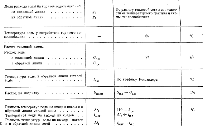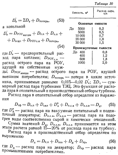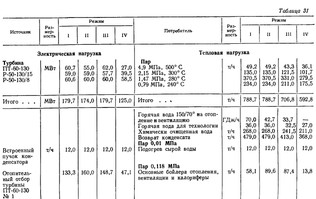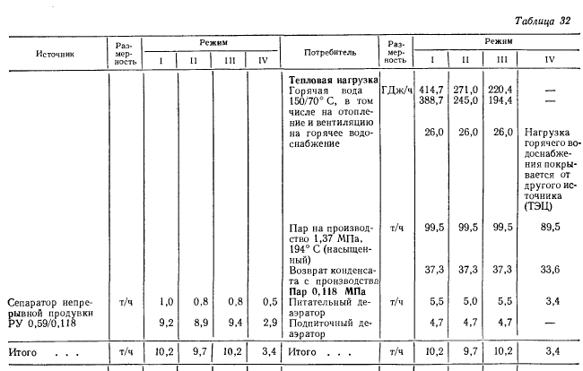 Расчеты тепловых схемРасчет тепловой схемы источника теплоснабжения является одним из основных, наиболее важных этапов проектирования. Цель — определение количественных и параметрических характеристик основных потоков пара и воды, выбор на основании этих характеристик основного и вспомогательного оборудования, определение диаметров трубопроводов, мощности турбин и производительности водоподготовки. Для выполнения расчета составляют принципиальную расчетную схему, содержащую следующие элементы: 1. Условное изображение основного и вспомогательного оборудования 2. Однолинейное изображение коммуникаций. 3. Параметры работы оборудования (давление, температура, теплосодержание). 4. Расходы среды по расчетным режимам. Тепловая схема рассматривается для четырех характерных режимов. Каждый из них отличается определенным значением наружной температуры, которой соответствуют тепловые нагрузки отопления, вентиляции и горячего водоснабжения. Первый режим — максимально-зимний, соответствует расчетной наружной температуре воздуха для проектирования отопления. Необходим для проверки обеспечения основным оборудованием пика тепловых нагрузок. Второй режим — соответствует средней температуре самого холодного месяца. В этом режиме должна обеспечиваться максимально длительная выдача тепла для технологии, средняя за наиболее холодный месяц выдачи тепла на отопление и среднечасовая нагрузка горячего водоснабжения при условии выхода из строя наиболее мощного парового или водогрейного котла. Необходим для выбора количества котлоагрегатов. Третий режим — среднезимний, соответствует средней температуре за отопительный период. Необходим для расчета среднегодовых технико-экономических показателей и выбора оптимального режима работы основного оборудования. Четвертый режим — среднелетний, характеризуется отсутствием тепловых нагрузок отопления и вентиляции. Необходим для расчета среднегодовых технико-экономических показателей и выбора оптимального режима работы основного оборудования. Тепловые нагрузки технологических потребителей в общем случае не являются функцией наружных температур, поэтому привязка указанных нагрузок к режимам, определяемых наружными температурами, является в определенной мере условной. Однако с целью учета всех тепловых нагрузок, обеспечиваемых от источника теплоснабжения, технологические нагрузки определяют по приведенным выше режимам на основании данных о потреблении тепла по конкретным видам производственного потребления. При отсутствии таких данных технологическая нагрузка принимается равной максимальному ее значению в первом, втором и третьем режимах, а в четвертом она снижается на 20—30%. Расчет тепловой схемы выполняется последовательно для каждого из четырех режимов на основании сводной таблицы тепловых нагрузок и расчетных схем. Поскольку расчет тепловой схемы ТЭЦ и котельной имеет много общих элементов, рассмотрим методику расчета на примере промышленно-отопительной ТЭЦ с необходимыми замечаниями, относящимися к котельным. Расчет удобно разделить на несколько этапов. 1 Определение исходных данных. На этом этапе выполняют следующие операции: а) уточнение тепловых и электрических нагрузок; б) выбор типа источника и ориентировочного состава основного оборудован
