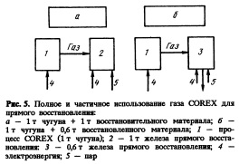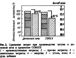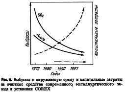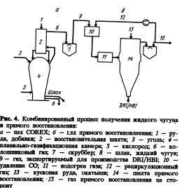 КОМБИНИРОВАННАЯ (ИНТЕГРИРОВАННАЯ) ТЕХНОЛОГИЯ ПРОИЗВОДСТВА ЧУГУНА (COREX) И ЖЕЛЕЗА ПРЯМОГО ВОССТАНОВЛЕНИЯРяд новых плавильновосстановительных процессов получения жидкого чугуна находятся на различной стадии промышленного освоения. Цель этих работ заключается в снижении энергозатрат, в расширении сортамента используемых сырых материалов, в снижении вредных выбросов в окружающую среду и в снижении стоимости. Производство чугуна в доменных печах требует большого количества кокса. Но из всего мирового запаса углей только 10% могут использоваться для приготовления металлургического кокса В связи с этим работы по созданию процессов альтернативных доеменному велись на протяжении многих лет. В настоящее время процесс COREX является единственным промышленным процессом, который может служить альтернативой доменному процессу. Эта уникальная комбинация позволяет не только существенно сократить энергетические затраты, но и создать новое выдающееся поколение технологических процессов, не загрязняющих окружающую среду.Процесс COREX производства чугуна и продуктов прямого восстановления Процесс COREX это плавильновосстановительный процесс для получения жидкого чугуна из руды и угля с низкими затратами и минимальными вредными выбросами в окружающую среду (рис. 1). Процесс разрабатывался в течение ряда лет совместными работами VOEST—ALPINE In dustrienanlagenbau, ее германским отделением и бывшей компаний "KORF". Впервые результаты работ были представлены в конце лета 1982 г. и вызвали широкий мировой интерес. Сейчас около 20 плавильновосстанови тельных процессов находятся в стадии разработки или в опытной эксплуатации. Процесс COREX — пока единственный процесс, который вышел на промышленную эксплуатацию и выдает жидкий чугун, используя руду и некоксующий ся уголь. Качество чугуна, поизводимого на установке COREX, является таким же, как и качество чугуна из обычных доменных печей. Можно отметить, что пока процессу COREX нет альтернативы. Только процесс COREX получил полное развитие и находится в эксплуатации в промышленных масштабах. Основываясь на положительных результатах, полученных на опытной установке, первая установка с производительностью 1000т/сут была заказана компанией "ISCOR" (Южная Африка) в 1985 г. Эта первая промышленная установка имела производительность 300000 т/год чугуна. С конца 1987 г. установка работает с полным одобрением компании "ISCOR". батывается в сталь на электропечах завода Pretoria Works. Основываясь на условиях Южной Африки, себестоимость продукции при использовании процесса COREX была снижена на 25% по сравнению с традиционным процессом получения чугуна в доменных печах (рис. 2). Приведем средние данные по производству и потреблению (апрель—сентябрь, 1993 г.). Состав чугуна, %: 4,24 С; 0,6 Si; 0,33 S; 0,16 Р. Температура 1493 °С; выход шлака 0,45 кг/т. Расход: 1497 кг/т руды; 1183 кг/т угля; 424 кг/т флюсов; 588 MVT кислорода. В декабре 1992 г. одна из крупнейших металлургических компаний мира TOSCO” в Южной Корее подписала контракт на сооружение на заводе Поханг установки для производства 2000 т/сут чугуна. Годовая производительность составит 600000 т при работе на кусковой руде и 800000 т при работе на окатышах. Пуск установки предстоит в 1995 г.