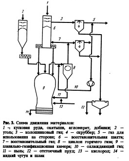 Удаление углекислого газа производится известными и опробованными процессами, такими как циклической адсорбцией по давлением или химическим процессом (например, моно этаноламиновой очисткой). Для получения оптимальной температуры восстановительного газа (перед тем, как он будет подан в восстановительную шахту) после удаления углекислого газа газ необходимо подогреть. В теплообменнике газ прогревается примерно на 400 °С. Подогрев газа до температуры 850 °С (наиболее подходилиая температура восстановления) должен происходить очень быстро, чтобы не допустить выделения элементарного углерода. Для этой цели небольшое количество газа смешивают с кислородом и вместе с овновной массой газа вдувают в камеру сгорания, где температура и поднимается до заданной и составляет 850 °С. Подогретый восстановительный газ поступает в нижнюю часть шахты и проходит через опускающуюся сверху шихту, состоящую из окисленного материала. Восстановленная железная руда опускается вниз шахты и выгружается непрерывно. Восстановительный газ, отходящий из шихты, содержит С02 и HjO. Поэтому, чтобы снова начинать цикл, он должен быть очищен oi С02 и НА Большая часть HjO конденсируется при очистке газа в результате прохождения его через мокрый скруббер. Удаление С02 производится в рассмотренных ранее системах. Система непрерывной выгрузки В зависимости от того, используется ли восстановленное железо в рядом стоящем сталеплавильном цехе или отправляется на сторону, выгрузку проводят в виде холодных или горячих брикетов. Холодная выгрузка В нижней части восстановительной шахты восстановленный продукт охлаждается циркулирующим газом. Охлаждающий газ отбирается из верхней части шахты, охлаждается и очищается в скруббере и через компрессор подается в нижнюю часть шахты. Охлажденный металлизованный материал непрерывно выгружается из нижней части шахты. Мелочь и пыль от металлизованного материала направляется на установку холодного брикетирования с использованием жидких связующих. Другая возможность использования мелочи и пыли — это подача их в плавильно газификационную камеру установки COREX. В этом случае брикетирования не требуется. Система горячего брикетирования Поток горячего восстановленного материала направляется в машину горячего брикетирования, которая выдает непрерывную полосу брикетов. Полоса разделяется на специальном устройстве на отдельные брикеты, которые потом направляются на вибрационное сито. Отсев после вибрационного сита возвращается на брикетирующее устройство. Брикеты из брикетирующего устройства направляются на охлаждение, производимое водой, а затем при температуре приблизительно 100 °С их подвергают сушке и направляют на склад. В отсев отходит очень небольшая часть продукции и получаемые брикеты восстановленного железа имеют высокую сопротивляемость к вторичному окислению, поэтому их можно перевозить автомобильным и морским транспортом по железной дороге.? Если не требуется максимального производства восстановленного материала, то остающийся не используемый газ может направляться на производство энвртш. При этом полностью или тасхичто покушаются энергетические затраты, необходимые для работы установки COREX. Соотношение между производством чугуна и восстановленного материала зависит от количества и качест