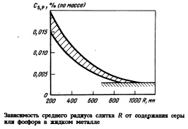 Необходимое содержание водорода достигается только при предварительном вакуумиро- вании нераскисленного металла в ковше под высокоокисленным шлаком и снижением в нем содержания водорода перед разливкой до 2,0 ррт. Интенсифицировать обезводорожива- ние можно, поэтому большое значение имеет угол раскрытия струи жидкого металла при вхождении ее в вакуумную камеру. Практика показывает, что для успешного протекания обезводороживания он не должен быть менее 30 °С. Величина угла раскрытия определяется степенью окисленности металла перед разливкой. При разрежении в вакуумной камере <1 гПа угол раскрытия 3060 ° имеет место при разливке стали с акивностью кислорода 4060 ррт. Значительно более сложной технологической задачей является борьба с образующимися в крупных слитках шнурами внецентренной ликвации. Разработанный и применяемый на сегодняшний день комплекс мероприятий не* позволяет полностью устранить их в слитках массой более 70 т. Однако применением ряда технологических мероприятий добиться существенного уменьшения их размеров возможно. Одним из главных условий, обеспечивающих это, является снижение содержания в стали серы и фосфора до уровня ниже 0,005 % и глубокое раскисление без применения обычных раскислителей. Снижение содержания фосфора до указанных значений трудная, но традиционная задача. Более сложной является проблема удаления серы из-за требования к низкому содержанию в стали элементов- раскислителей. Поэтому десульфурация должна проводиться с использованием специальной технологии внепечной обработки. Она заключается в наведении большого количества специального десульфурирующего шлака с высокой серопоглотительной способностью, раскисления шлака только алюминиевым порошком со снижением активности кислорода в металле до 4060 ррт с последующим тщательным пере-мешиванием металла со шлаком, обеспечивающим эмульгирование последнего в металле.