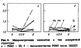 На 2 и 10т установках легирование азотом длится 10—15 мин, в общем операции под давлением длятся около 60 мин при минимальном расходе электроэнергии — около 100 кВт*ч/т. Известно, что для переплава при атмосферных условиях той же массы металла промышленно отработанными методами переплава нужно на порядок больше и времени, и электроэнергии [5—12]. При необходимости в производстве металла высокой чистоты и специальной структуры БАНИМ и НИПКИТОКС разработан и промышленно внедрен оригинальный метод электрошлако вого переплава под давлением — ЭШПД (рис.З). При ЭШПД в основном используются высокоазотистые гомогенные (по азоту и другим легирующим элементам) электроды. При переплаве электродов, полученных по нашим технологиям с высоким содержанием азота, промышленный слиток гомогенен — сегрегация С и N ниже 5 %. Коэффициент ликвации уменьшается с 2 до 1,25 даже для ферритоперлитных сталей типа быстрорежущей стали Р6А2М5 (W6NMo5). Классическая дендритная структура (рис.4,а) заменяется равноосной (рис.4, б). Получается качественно новый слиток.