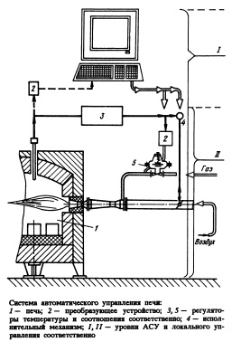 О ПЕРСПЕКТИВНОМ УПРАВЛЕНИИ ПРОЦЕССОМ ГОРЕНИЯ В ПРОМЫШЛЕННЫХ ПЕЧАХОписывается перспективная каскадно-связанная система локального управления промышленными печами, позволяющая качественно, надежно и эффективно осуществлять различные технологические режимы нагрева при рациональном расходовании топлива. Система может быть подключена к АСУ ТП.Процессы горения находят широкое применение в современной технологии металлургического, химического производства, в энергетике и других промышленных отраслях. Качественные показатели сжигания топлива во многом определяют экономичность, надежность и оптимальность ведения технологического процесса в различных топливопотребляющих установках Уровень обеспечения указанных требований можно наиболее эффективно реализовать системой автоматического управления температурного режима в сочетании с рациональной организацией процесса горения. В настоящее время автоматизация разного типа промышленных печей, работающих на газовом топливе, базируется на стабилизирующих локальных системах регулирования температуры, давления и т.д. Техническая реализация таких систем осуществляется контрольно-измерительной и регулирующей аппаратурой ГСП. В редких случаях применяются автоматические регуляторы прямого действия, позволяющие экономично с достаточной точностью и надежностью обеспечивать заданный температурный режим в печах. За рубежом такие регуляторы широко используются в управлении процессами горения. Перспектива развития промышленного производства, где процессам сжигания газового топлива отводится первостепенное значение в технологиях нагрева изделий из металла, керамики, стройматериалов и др., не ограничивается областью автоматического управления локальными системами В Самарском государственном техническом университете проводятся работы по использованию для автоматизации промышленных печей каскадно-связанных систем автоматического регулирования. Неограниченные возможности в области применения может иметь предлагаемое решение системы (см. рисунок), состоящей из регулятора температуры (непрямого действия) и регулятора соотношения прямого действия. Регулятор температуры может быть стабилизирующим или программным в зависимости от технологического процесса, а регулятор соотношения может обеспечивать заданную величину коэффициента расхода воздуха или его изменение с учетом нейтральной, восстанови-тельной или окислительной атмосферы в рабочем. пространстве печи. Результаты опытного и промышленного ис-пользования такого типа систем свидетельствуют об ик надежности, простоте в наладке и эксплуатации. Они обеспечивают до 5—7 % экономии топлива, снижение брака продукции в среднем на 10-15 % и ведение технологического процесса на уровне заданного. Особенностью такого способа управления является возможность включения системы в АСУ ТП на базе вычислительной или компьютерной техники, что является перспективным направлением автоматизации технологического агрегата в целом.